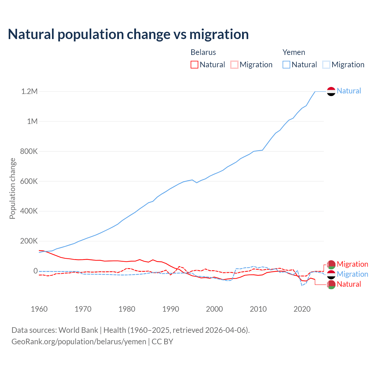 Over the last 10 years, 84.2% of the population change in Belarus is from natural causes (a loss of 318,682 people) and 15.8% is from migration (a loss of 59,605 people). In Yemen 97.8% is from natural causes (a gain of 10,460,813 people) and 2.17% is from migration (a loss of 231,814 people).