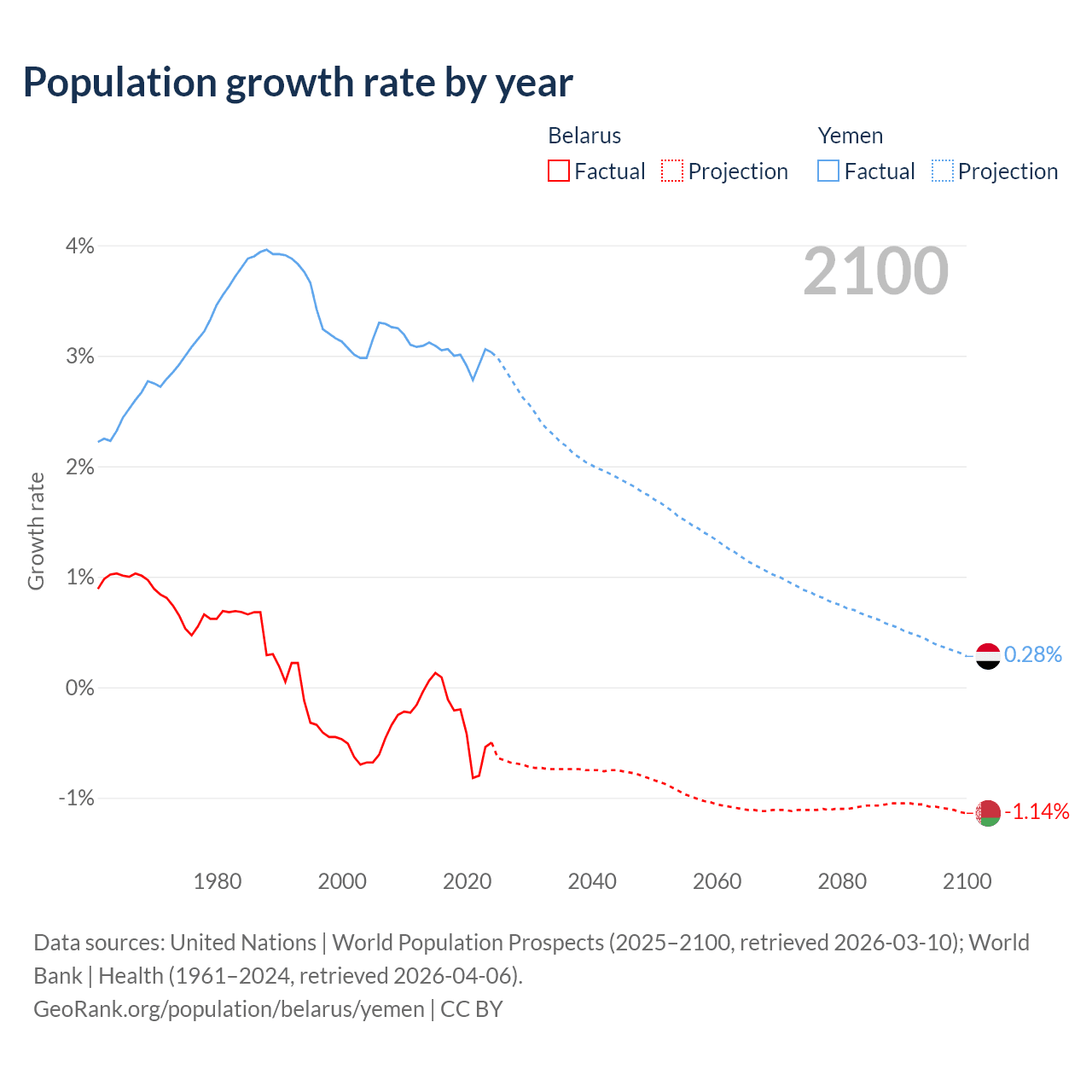 - For the last 10 years, Belarus has had an average growth rate of -0.3% per year vs +3% in Yemen.