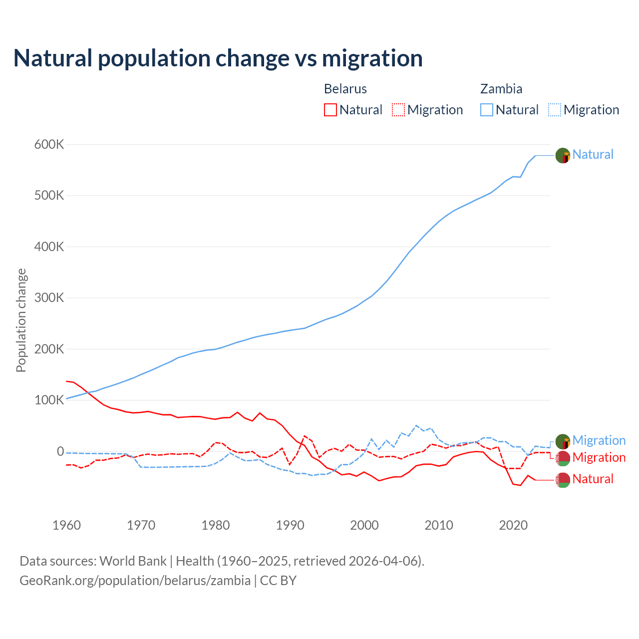 Over the last 10 years, 84.2% of the population change in Belarus is from natural causes (a loss of 318,682 people) and 15.8% is from migration (a loss of 59,605 people). In Zambia 97.4% is from natural causes (a gain of 5,233,797 people) and 2.58% is from migration (a gain of 138,554 people).
