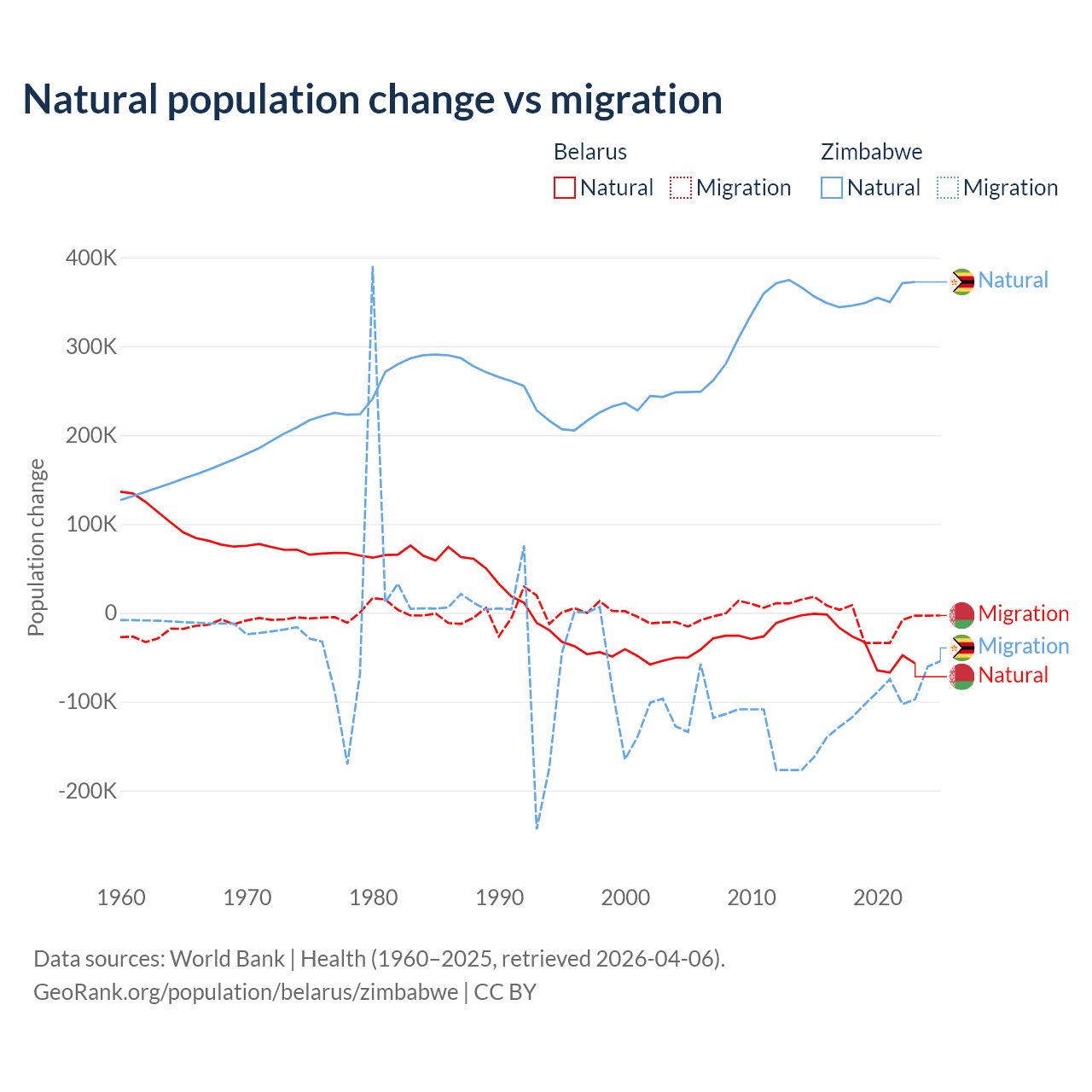 Over the last 10 years, 84.2% of the population change in Belarus is from natural causes (a loss of 318,682 people) and 15.8% is from migration (a loss of 59,605 people). In Zimbabwe 74.9% is from natural causes (a gain of 3,558,487 people) and 25.1% is from migration (a loss of 1,192,807 people).