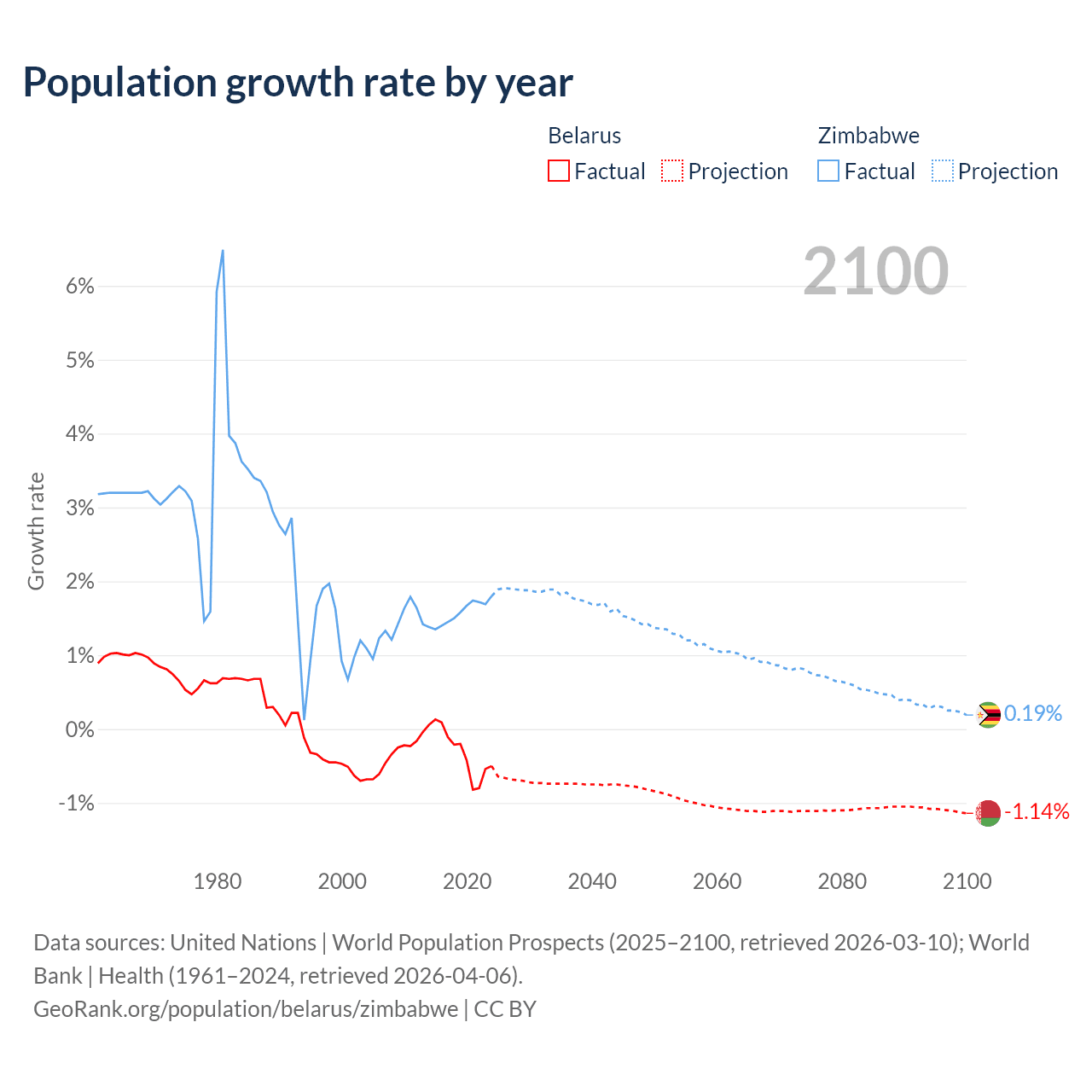 - Since 2006, the population of Belarus has decreased from 9.6M people to 9.01M (6.15% decline), while Zimbabwe has grown from 12.6M to 17.4M (37.4% growth).
