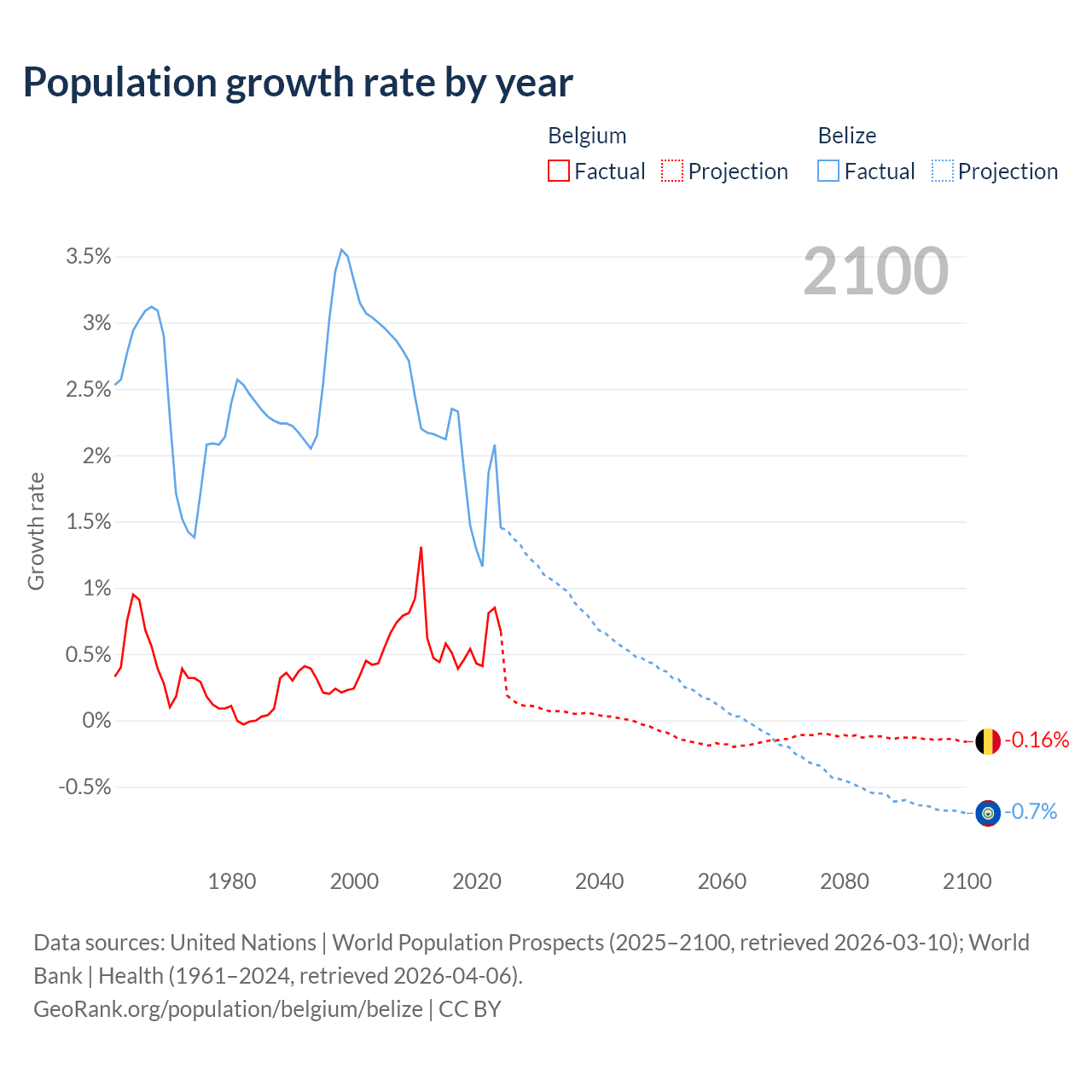 - For the last 10 years, Belgium has had an average growth rate of +0.55% per year vs +1.83% in Belize.