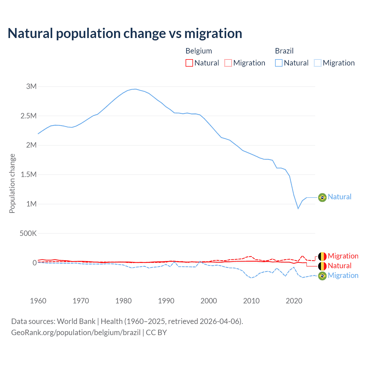 Over the last 10 years, 11.3% of the population change in Belgium is from natural causes (a gain of 64,346 people) and 88.7% is from migration (a gain of 504,240 people). In Brazil 89.1% is from natural causes (a gain of 14,004,164 people) and 10.9% is from migration (a loss of 1,708,894 people).