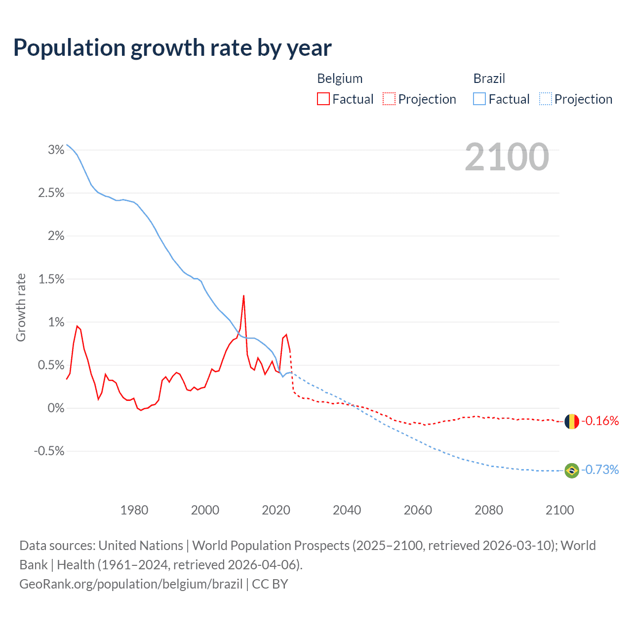 - For the last 10 years, Belgium has had an average growth rate of +0.55% per year vs +0.6% in Brazil.