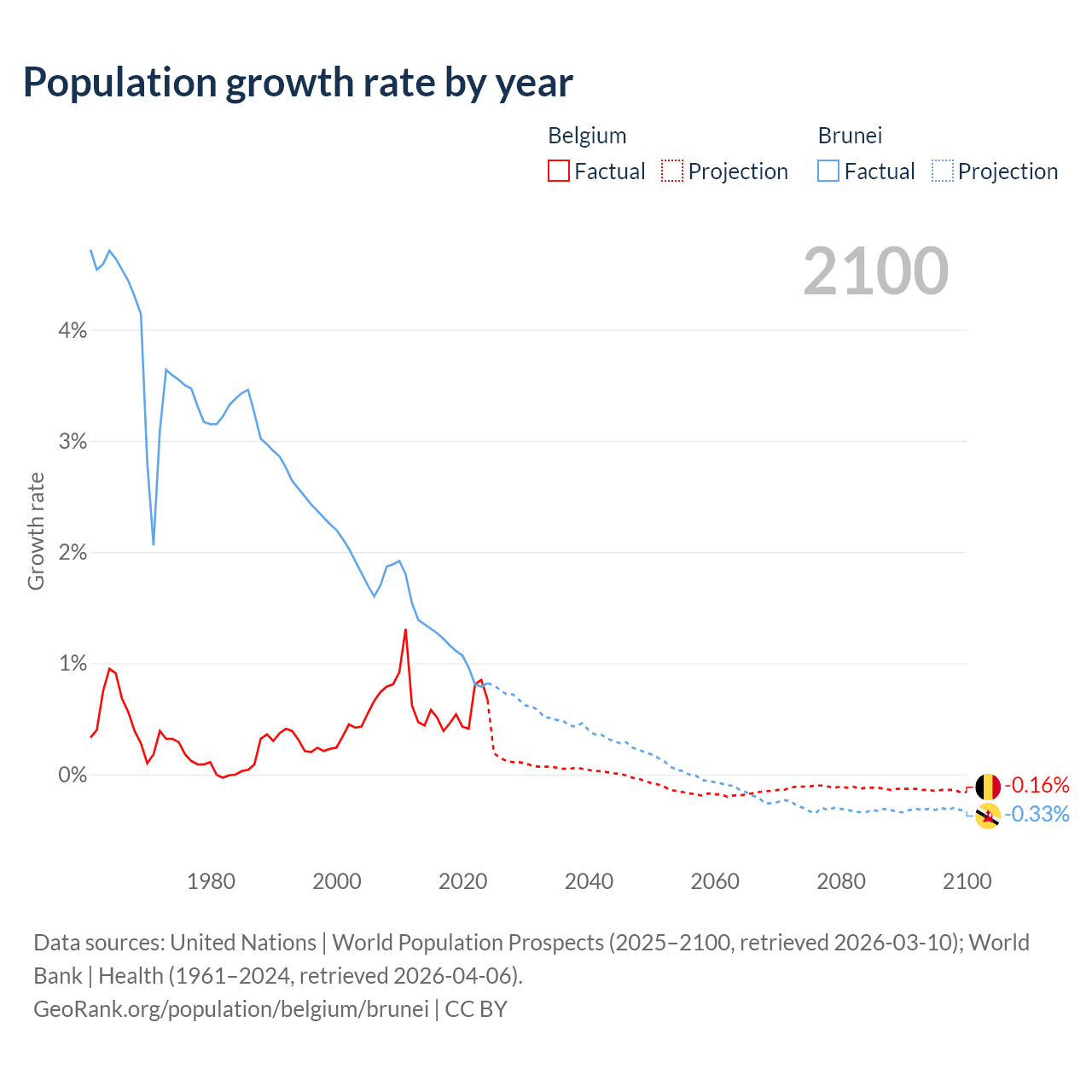 - For the last 10 years, Belgium has had an average growth rate of +0.55% per year vs +1.08% in Brunei.