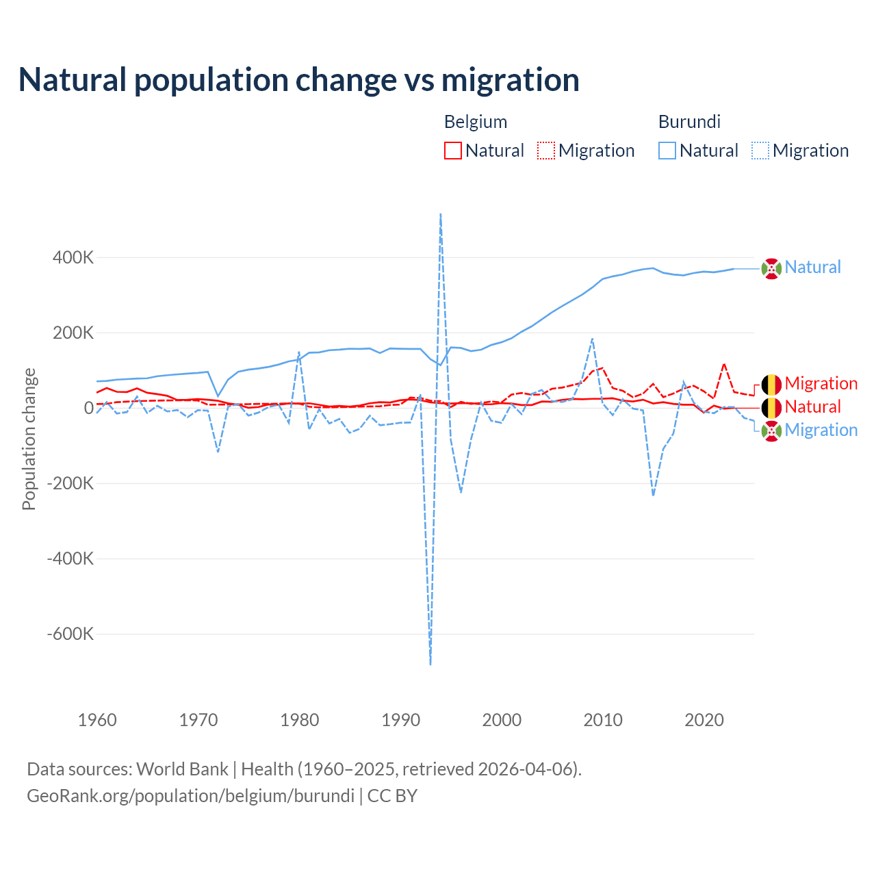 Over the last 10 years, 11.3% of the population change in Belgium is from natural causes (a gain of 64,346 people) and 88.7% is from migration (a gain of 504,240 people). In Burundi 91% is from natural causes (a gain of 3,614,502 people) and 9.03% is from migration (a loss of 358,928 people).