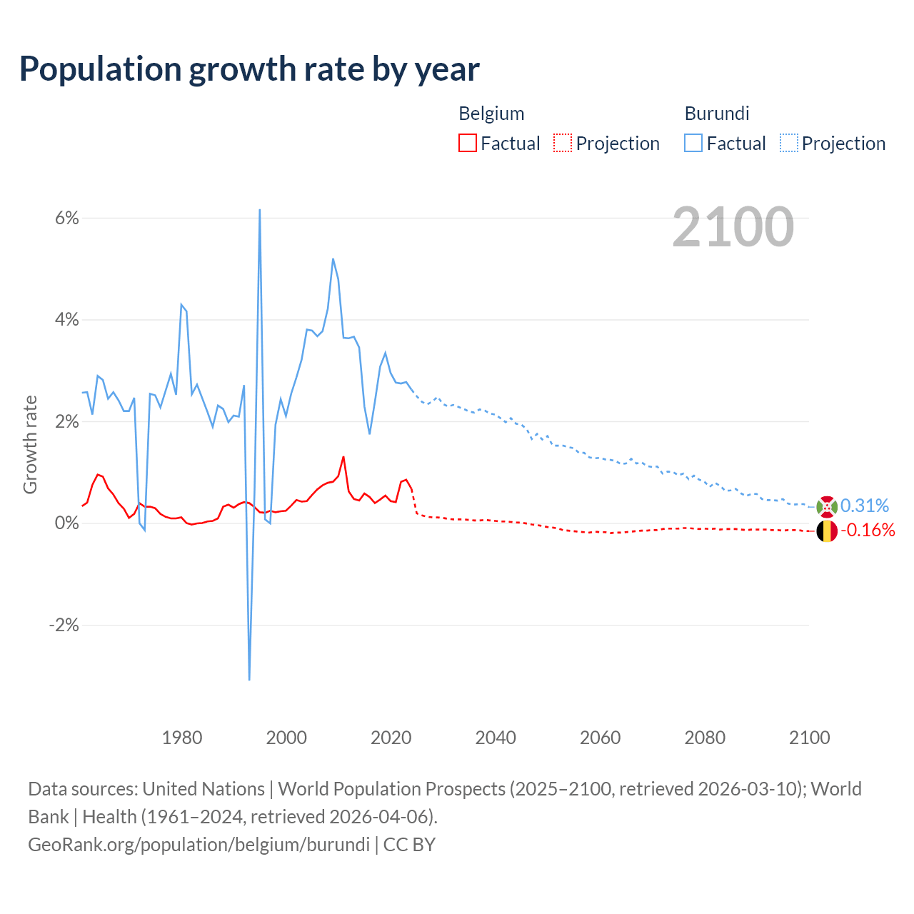 - For the last 10 years, Belgium has had an average growth rate of +0.55% per year vs +2.74% in Burundi.