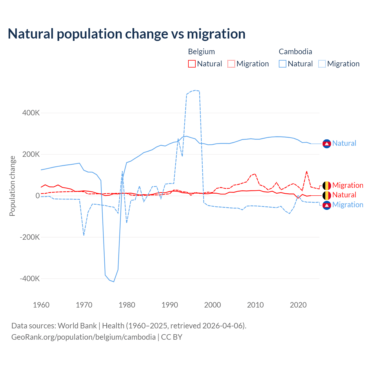 Over the last 10 years, 11.3% of the population change in Belgium is from natural causes (a gain of 64,346 people) and 88.7% is from migration (a gain of 504,240 people). In Cambodia 85.2% is from natural causes (a gain of 2,724,147 people) and 14.8% is from migration (a loss of 474,505 people).