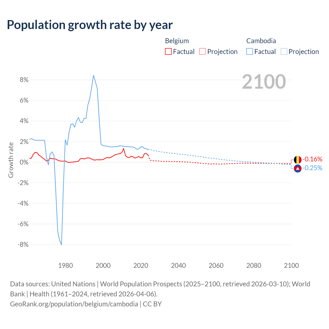- For the last 10 years, Belgium has had an average growth rate of +0.55% per year vs +1.38% in Cambodia.