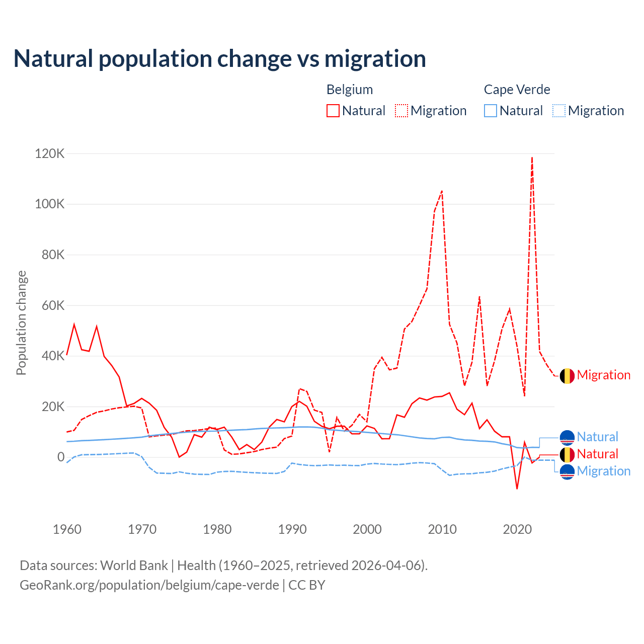 Over the last 10 years, 11.3% of the population change in Belgium is from natural causes (a gain of 64,346 people) and 88.7% is from migration (a gain of 504,240 people). In Cape Verde 56.4% is from natural causes (a gain of 50,193 people) and 43.6% is from migration (a loss of 38,879 people).