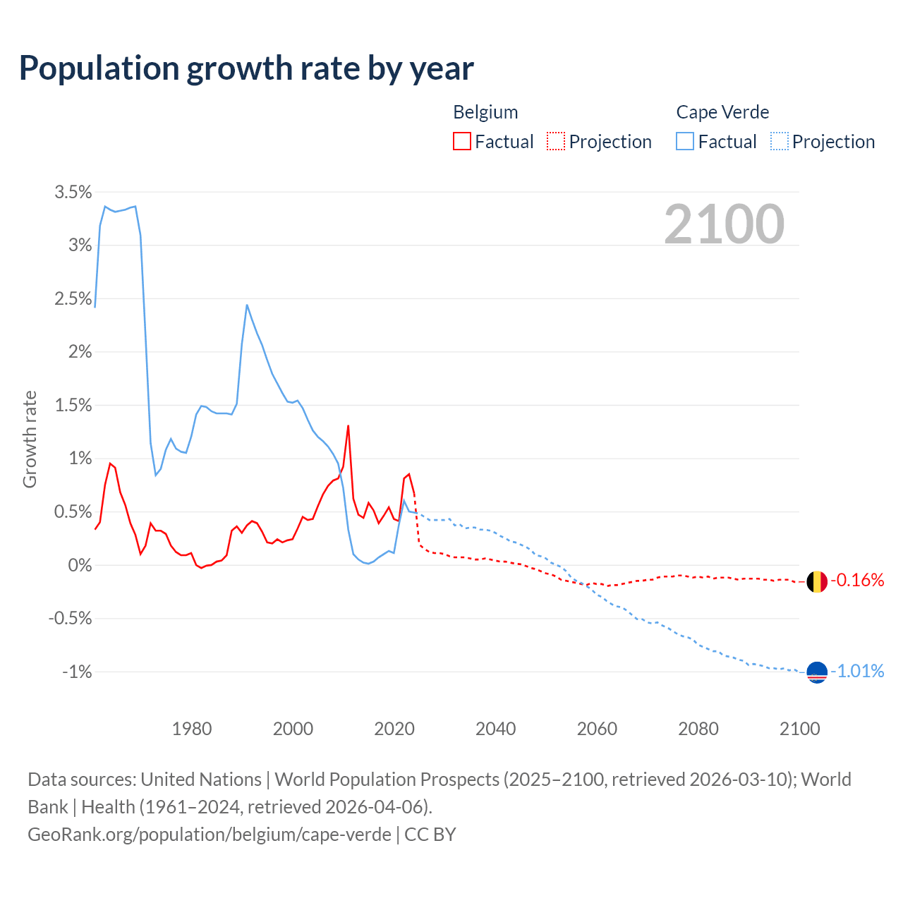 - For the last 10 years, Belgium has had an average growth rate of +0.55% per year vs +0.22% in Cape Verde.