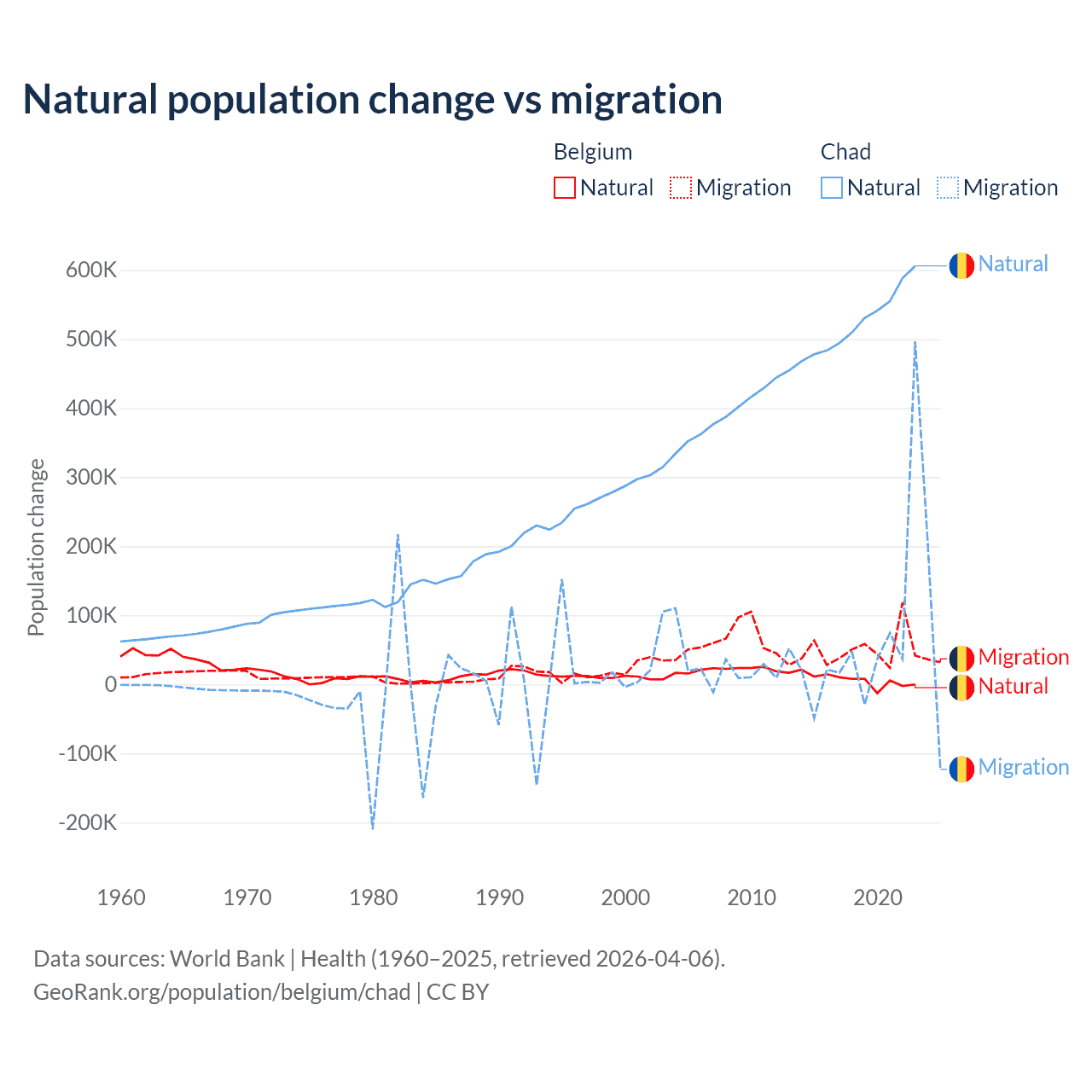 Over the last 10 years, 11.3% of the population change in Belgium is from natural causes (a gain of 64,346 people) and 88.7% is from migration (a gain of 504,240 people). In Chad 88.7% is from natural causes (a gain of 5,253,964 people) and 11.3% is from migration (a gain of 672,204 people).