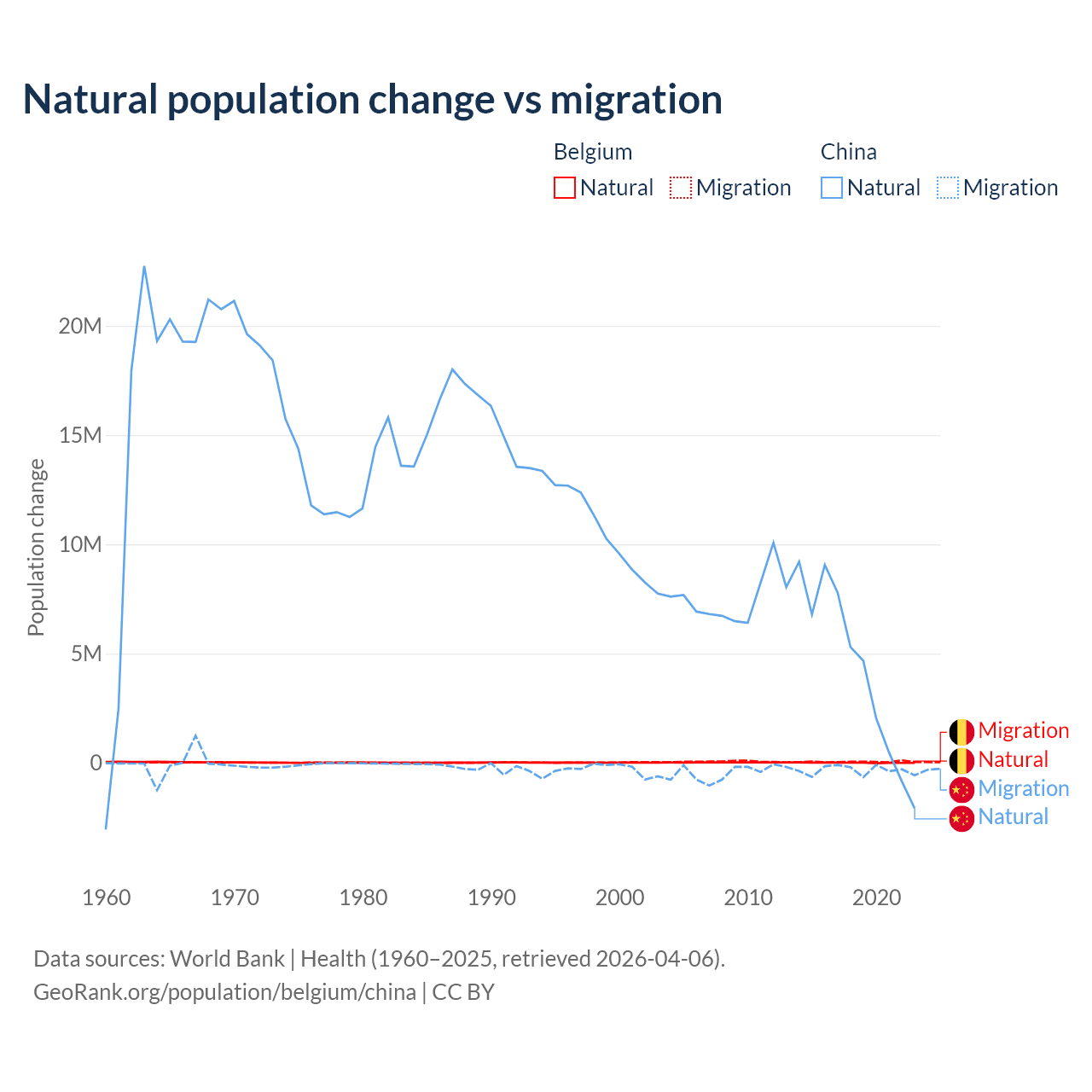 Over the last 10 years, 11.3% of the population change in Belgium is from natural causes (a gain of 64,346 people) and 88.7% is from migration (a gain of 504,240 people). In China 92.5% is from natural causes (a gain of 42,414,528 people) and 7.53% is from migration (a loss of 3,452,923 people).