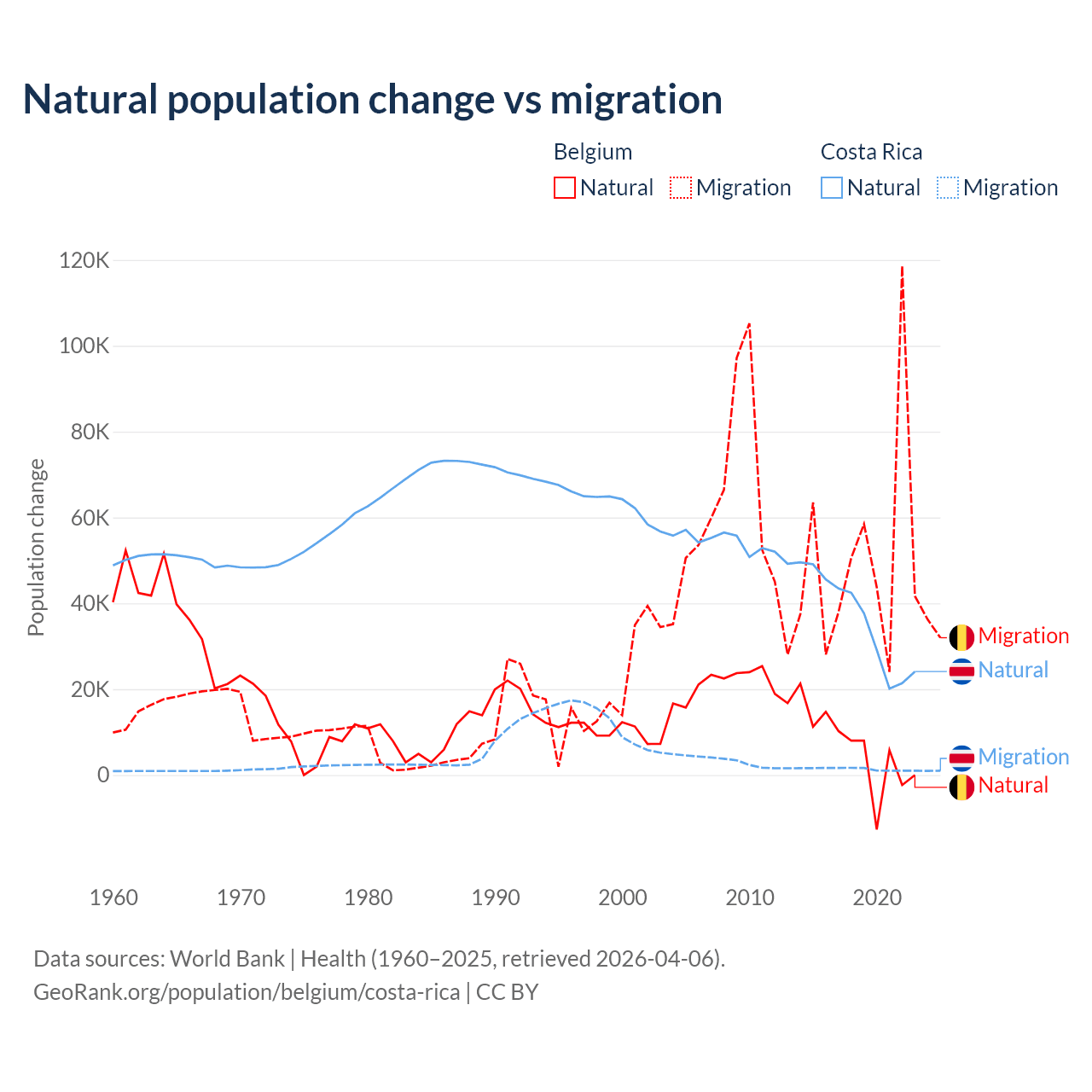 Over the last 10 years, 11.3% of the population change in Belgium is from natural causes (a gain of 64,346 people) and 88.7% is from migration (a gain of 504,240 people). In Costa Rica 96.3% is from natural causes (a gain of 362,624 people) and 3.69% is from migration (a gain of 13,900 people).