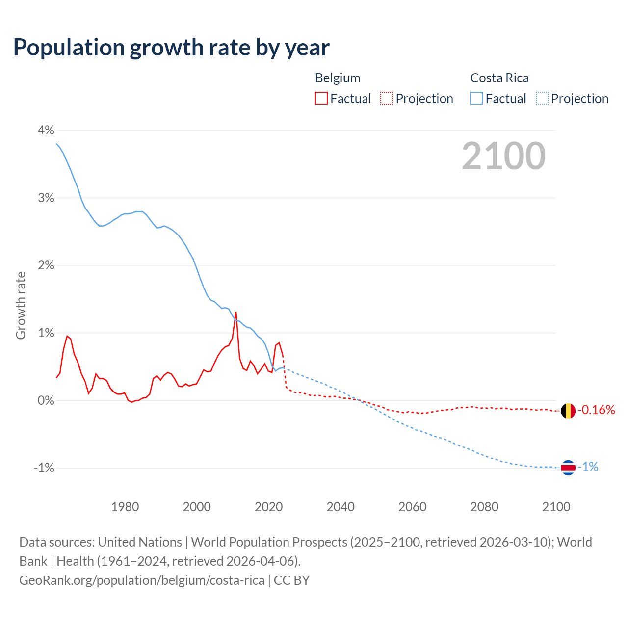 - For the last 10 years, Belgium has had an average growth rate of +0.55% per year vs +0.77% in Costa Rica.