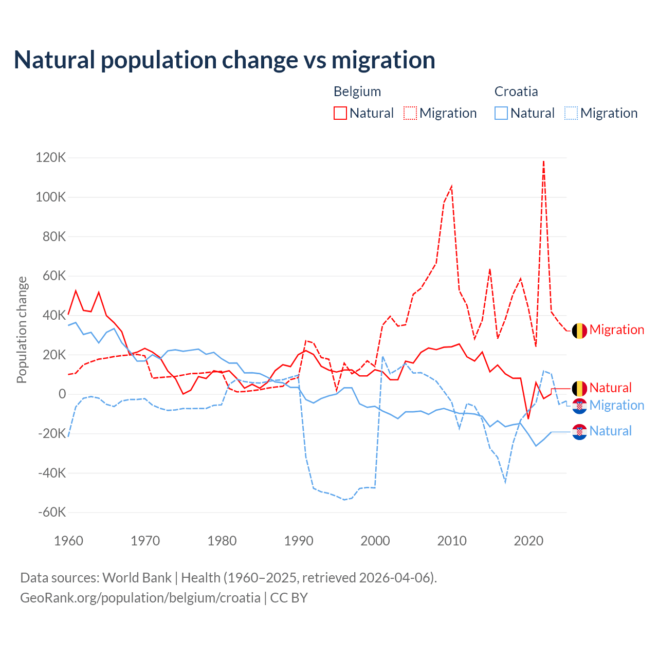 Over the last 10 years, 11.3% of the population change in Belgium is from natural causes (a gain of 64,346 people) and 88.7% is from migration (a gain of 504,240 people). In Croatia 54.8% is from natural causes (a loss of 177,803 people) and 45.2% is from migration (a loss of 146,770 people).