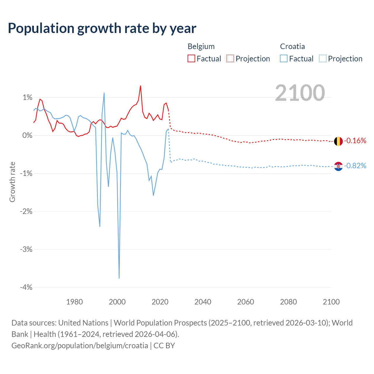 - For the last 10 years, Belgium has had an average growth rate of +0.55% per year vs -0.82% in Croatia.