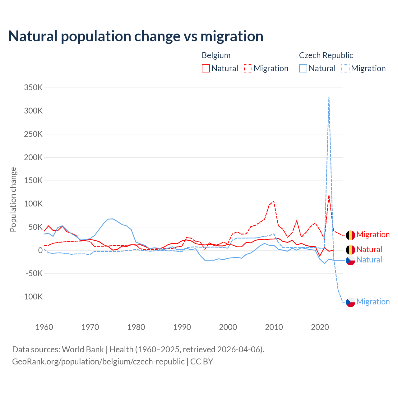 Over the last 10 years, 11.3% of the population change in Belgium is from natural causes (a gain of 64,346 people) and 88.7% is from migration (a gain of 504,240 people). In the Czech Republic 17.3% is from natural causes (a loss of 74,826 people) and 82.7% is from migration (a gain of 357,502 people).