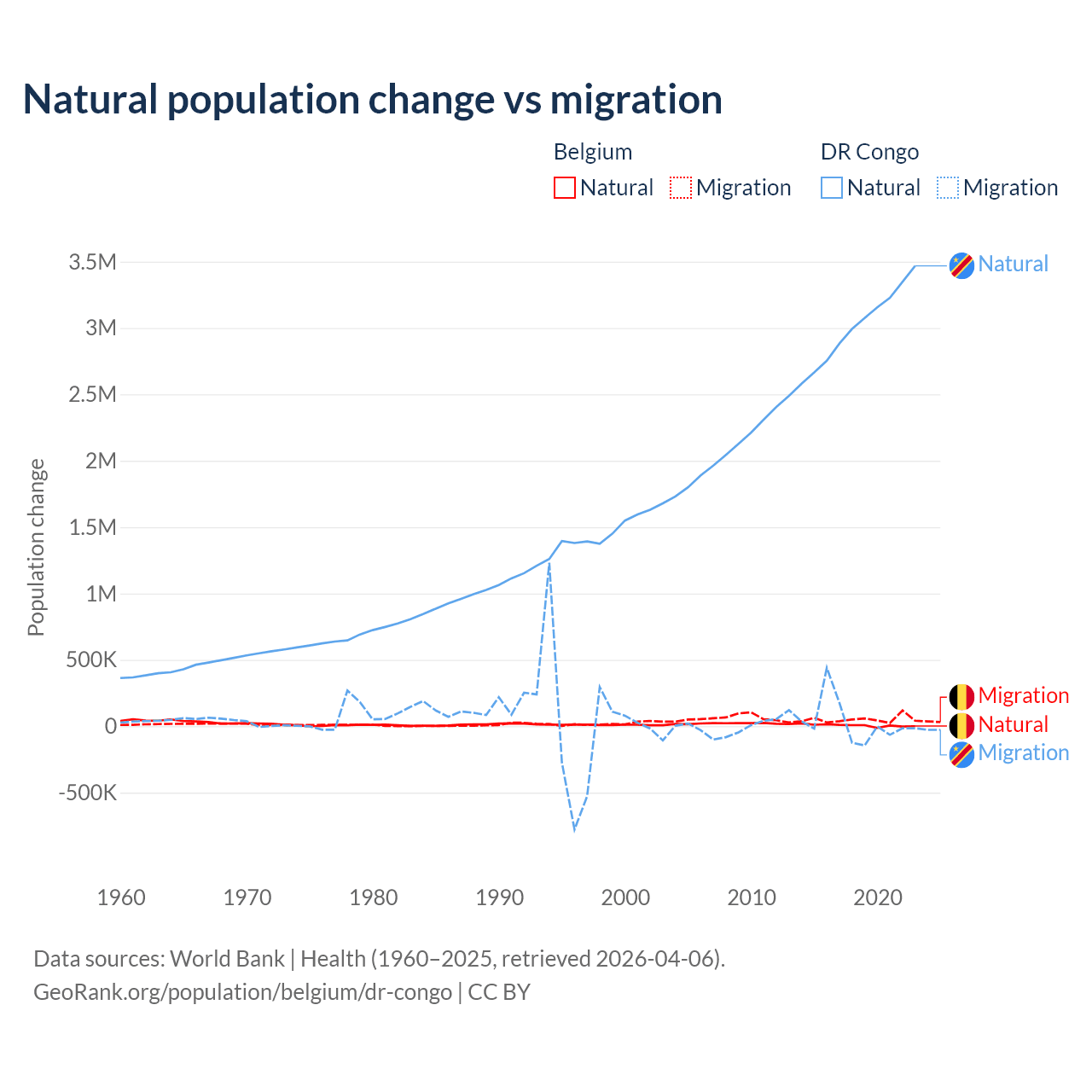 Over the last 10 years, 11.3% of the population change in Belgium is from natural causes (a gain of 64,346 people) and 88.7% is from migration (a gain of 504,240 people). In the DR Congo 99.1% is from natural causes (a gain of 30,150,516 people) and 0.89% is from migration (a gain of 270,872 people).