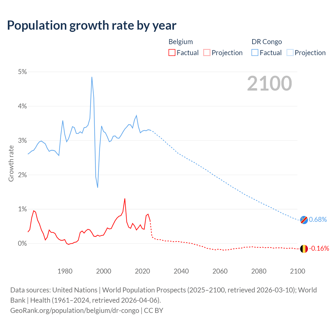 - For the last 10 years, Belgium has had an average growth rate of +0.55% per year vs +3.38% in the DR Congo.