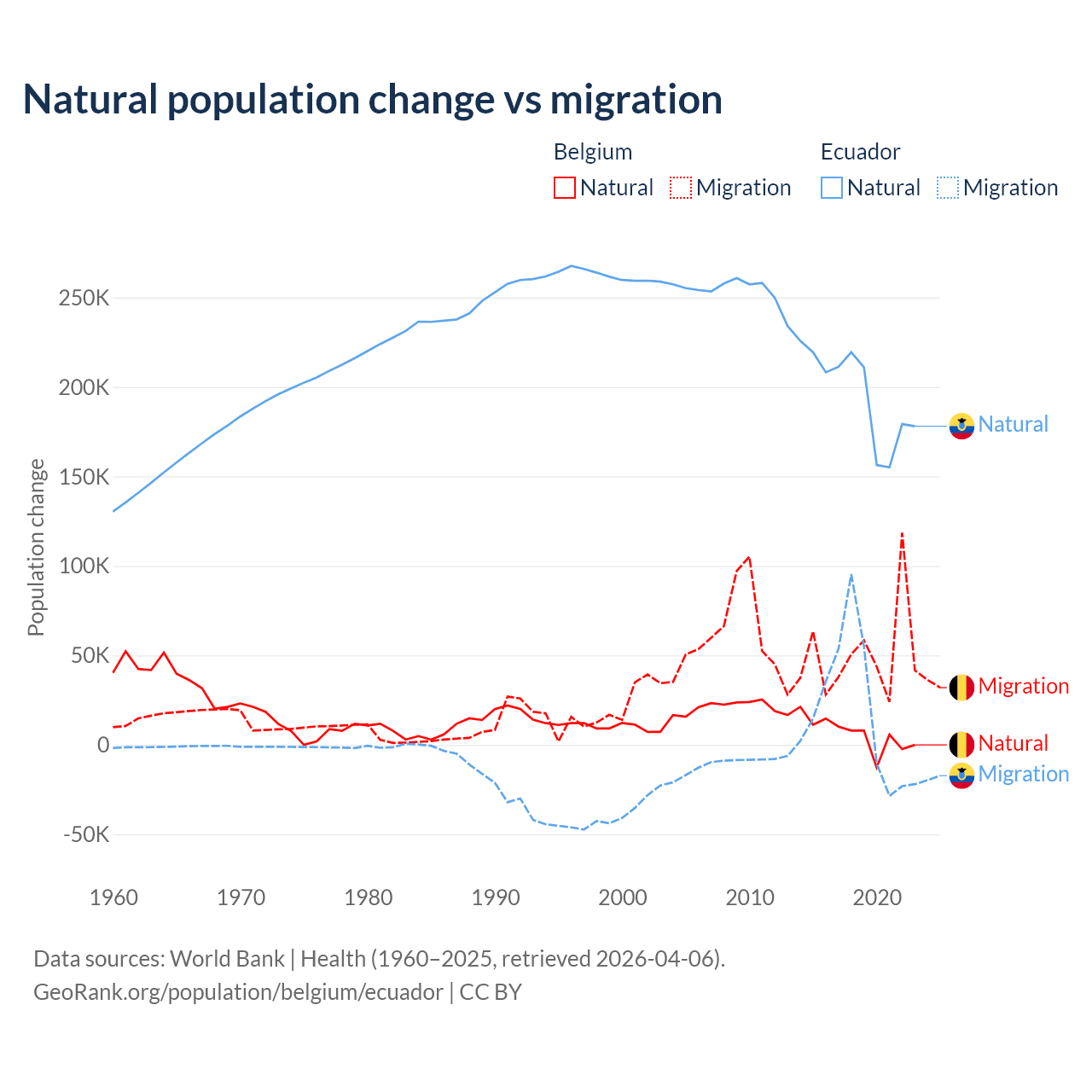 Over the last 10 years, 11.3% of the population change in Belgium is from natural causes (a gain of 64,346 people) and 88.7% is from migration (a gain of 504,240 people). In Ecuador 91.9% is from natural causes (a gain of 1,964,352 people) and 8.08% is from migration (a gain of 172,707 people).