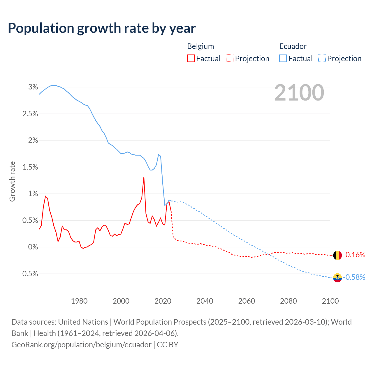 - For the last 10 years, Belgium has had an average growth rate of +0.55% per year vs +1.26% in Ecuador.