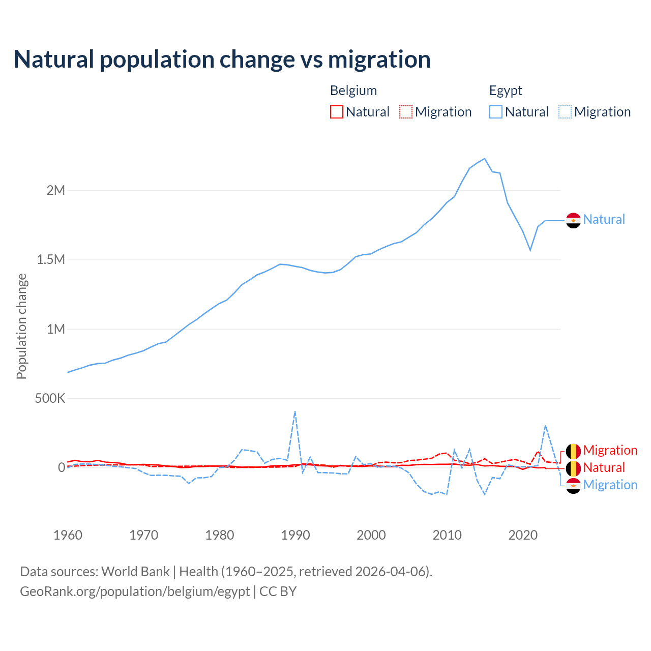 Over the last 10 years, 11.3% of the population change in Belgium is from natural causes (a gain of 64,346 people) and 88.7% is from migration (a gain of 504,240 people). In Egypt 99.6% is from natural causes (a gain of 19,180,073 people) and 0.41% is from migration (a loss of 78,975 people).