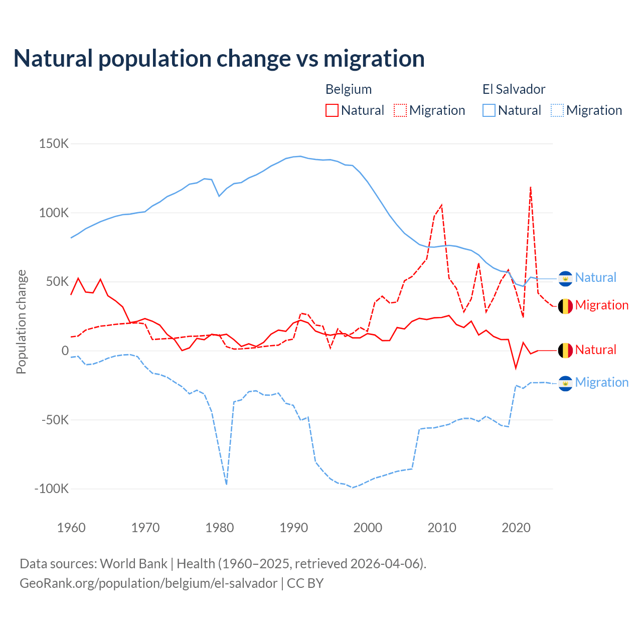 Over the last 10 years, 11.3% of the population change in Belgium is from natural causes (a gain of 64,346 people) and 88.7% is from migration (a gain of 504,240 people). In El Salvador 58.8% is from natural causes (a gain of 579,641 people) and 41.2% is from migration (a loss of 406,874 people).