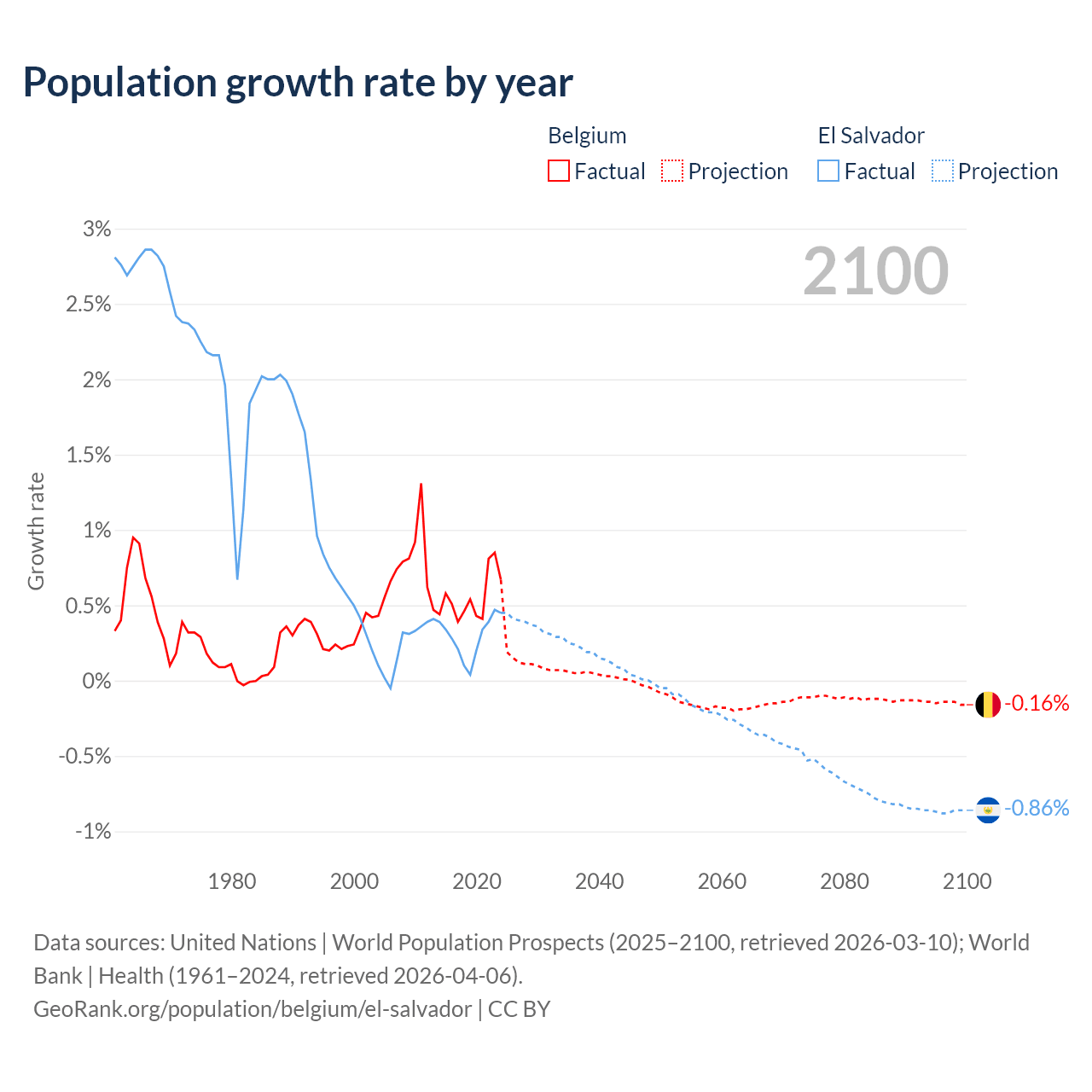- For the last 10 years, Belgium has had an average growth rate of +0.55% per year vs +0.29% in El Salvador.