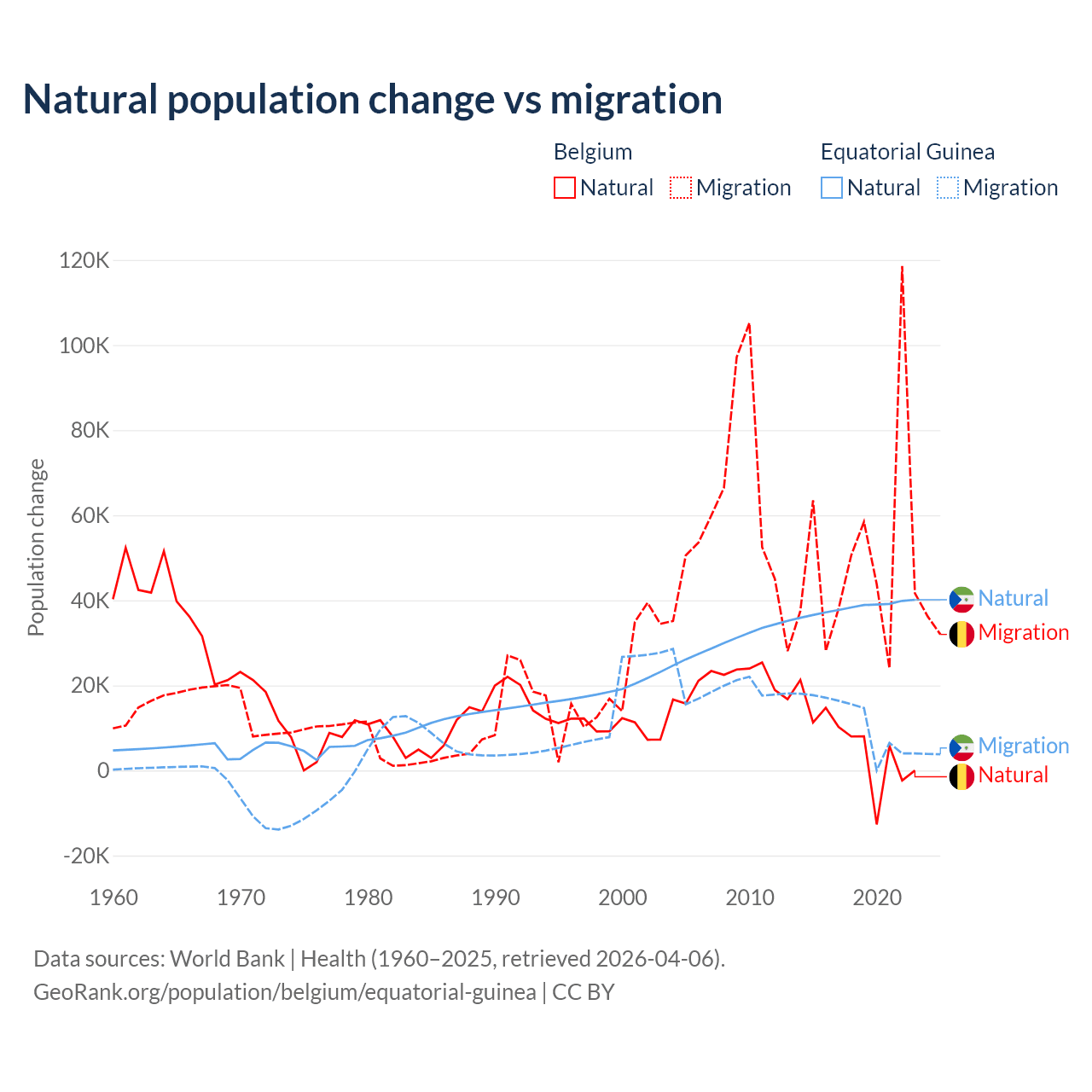 Over the last 10 years, 11.3% of the population change in Belgium is from natural causes (a gain of 64,346 people) and 88.7% is from migration (a gain of 504,240 people). In Equatorial Guinea 77% is from natural causes (a gain of 382,745 people) and 23% is from migration (a gain of 114,024 people).