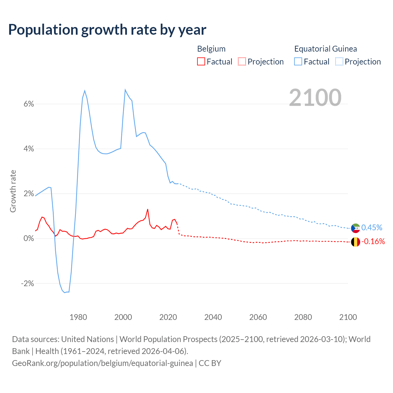 - For the last 10 years, Belgium has had an average growth rate of +0.55% per year vs +3.15% in Equatorial Guinea.