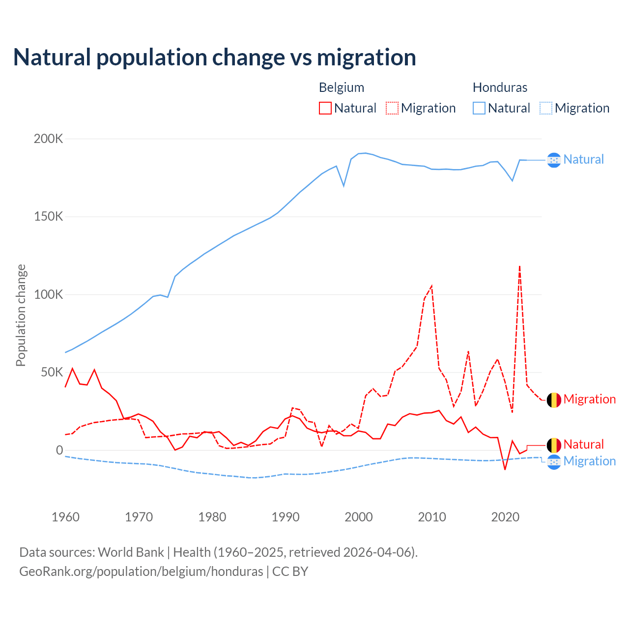 Over the last 10 years, 11.3% of the population change in Belgium is from natural causes (a gain of 64,346 people) and 88.7% is from migration (a gain of 504,240 people). In Honduras 96.7% is from natural causes (a gain of 1,821,125 people) and 3.29% is from migration (a loss of 61,965 people).
