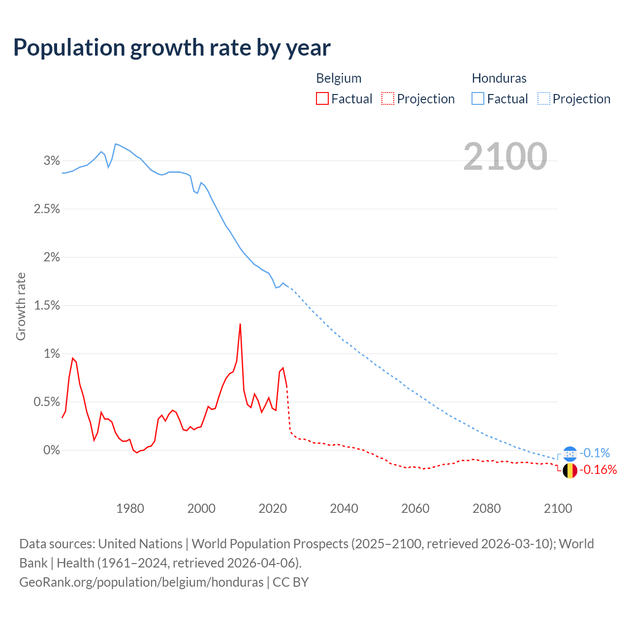 - For the last 10 years, Belgium has had an average growth rate of +0.55% per year vs +1.81% in Honduras.