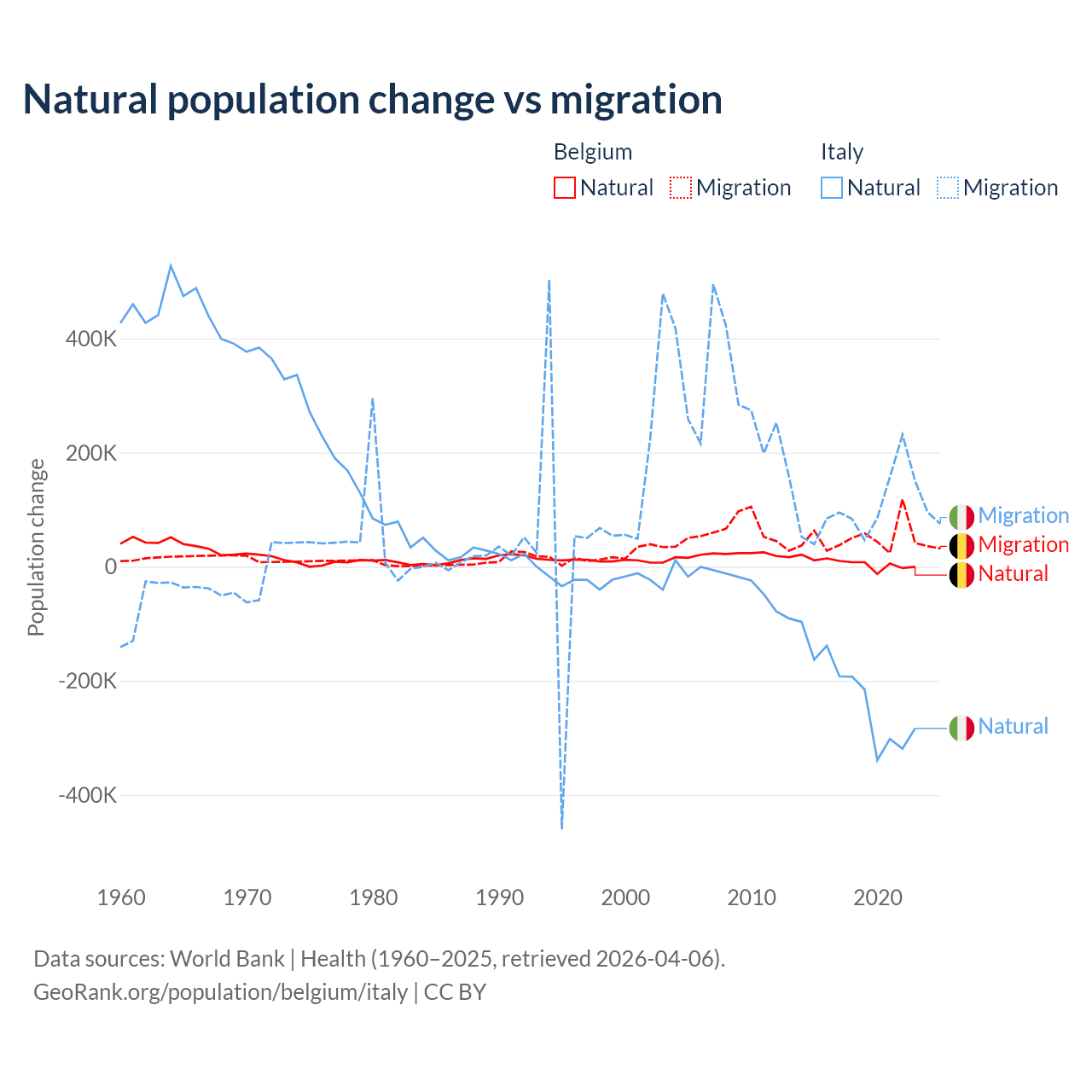 Over the last 10 years, 11.3% of the population change in Belgium is from natural causes (a gain of 64,346 people) and 88.7% is from migration (a gain of 504,240 people). In Italy 68.6% is from natural causes (a loss of 2,239,084 people) and 31.4% is from migration (a gain of 1,026,128 people).