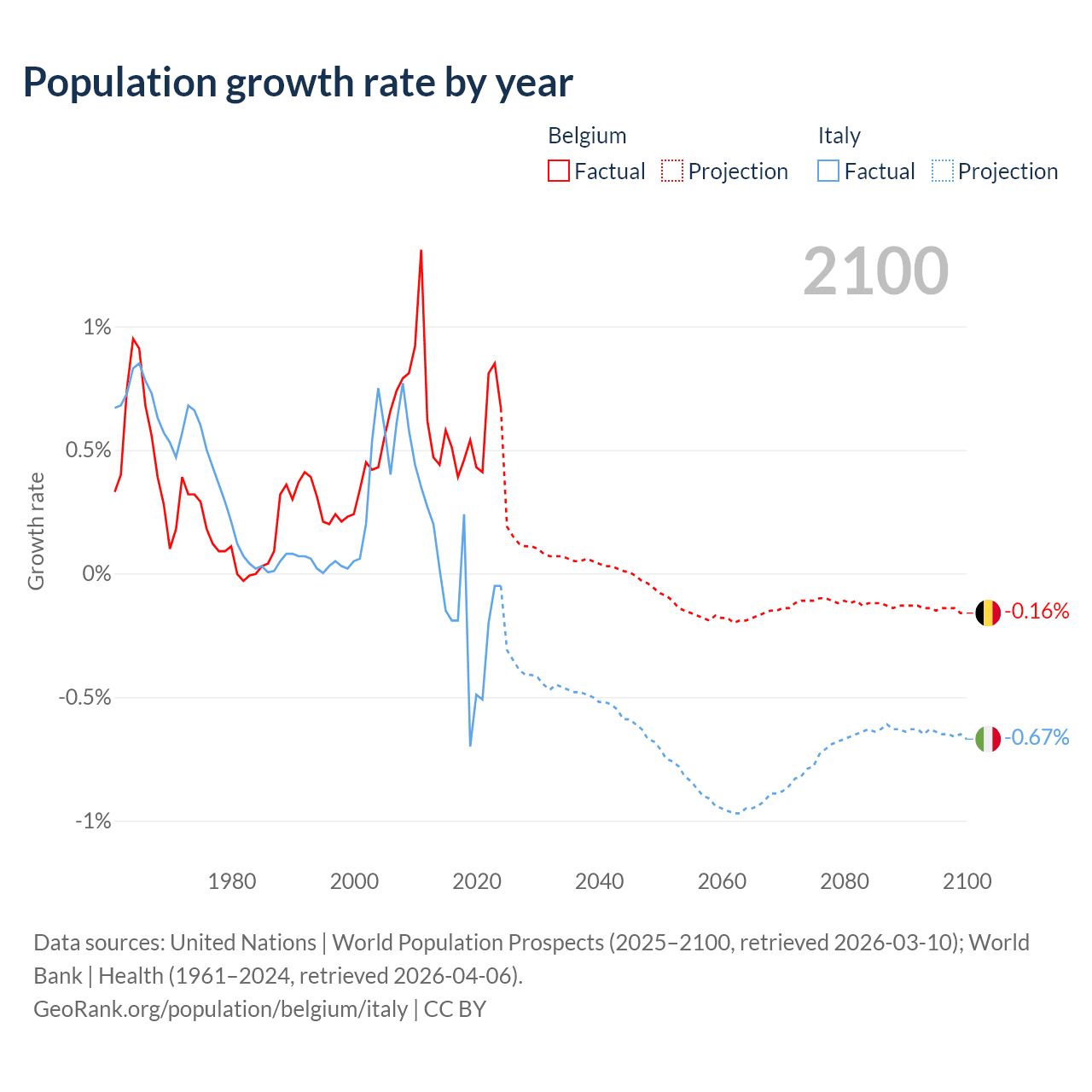- For the last 10 years, Belgium has had an average growth rate of +0.55% per year vs -0.21% in Italy.
