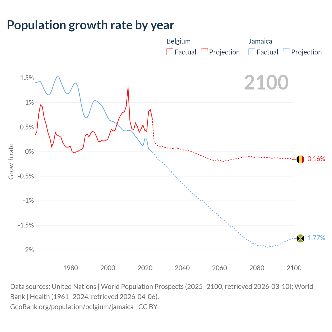 - For the last 10 years, Belgium has had an average growth rate of +0.55% per year vs +0.18% in Jamaica.