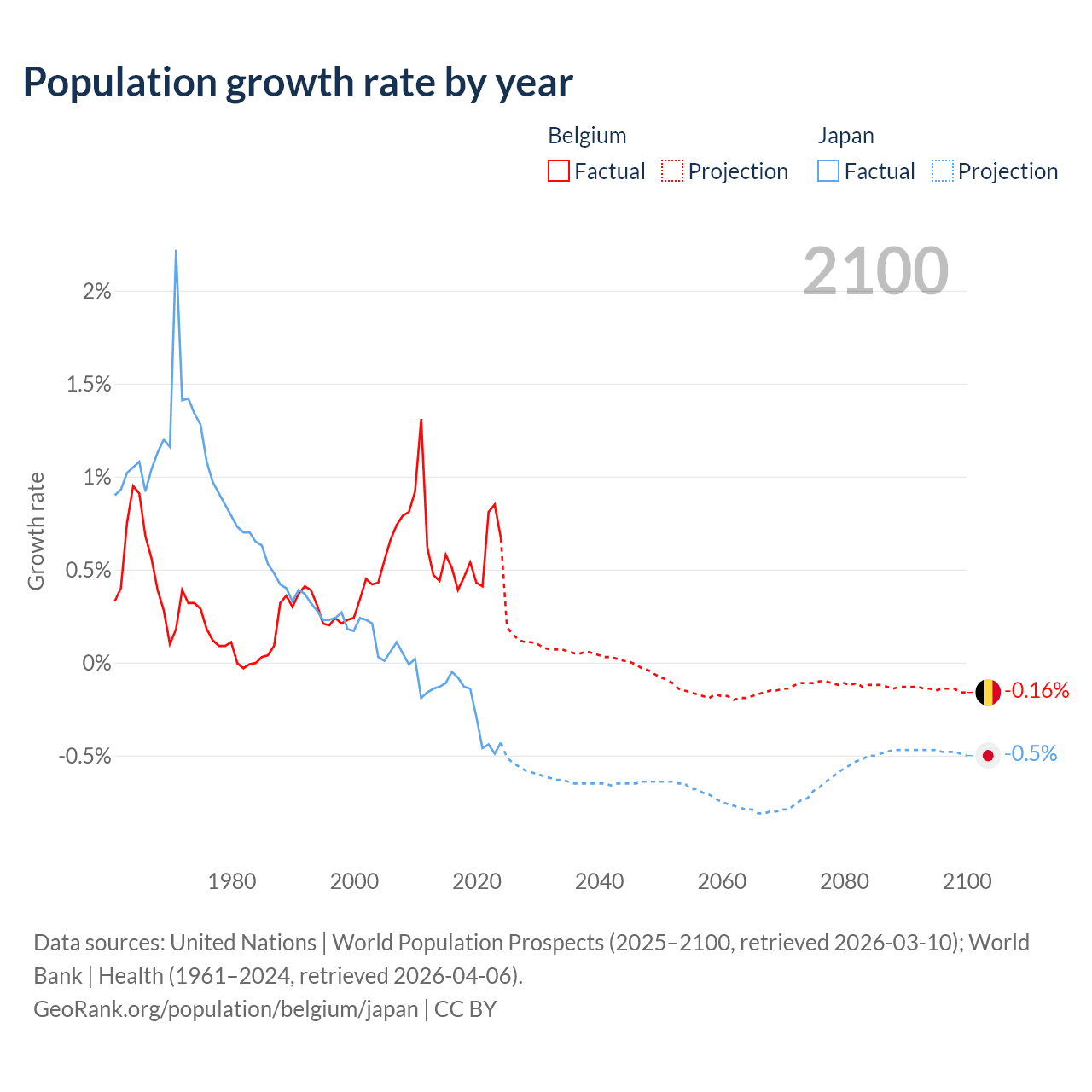 - For the last 10 years, Belgium has had an average growth rate of +0.55% per year vs -0.25% in Japan.