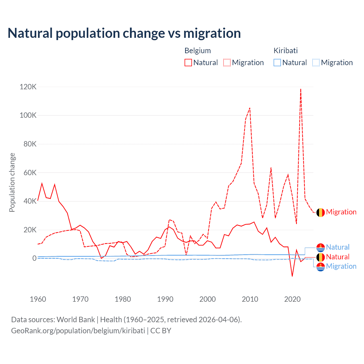 Over the last 10 years, 11.3% of the population change in Belgium is from natural causes (a gain of 64,346 people) and 88.7% is from migration (a gain of 504,240 people). In Kiribati 80% is from natural causes (a gain of 25,262 people) and 20% is from migration (a loss of 6,330 people).