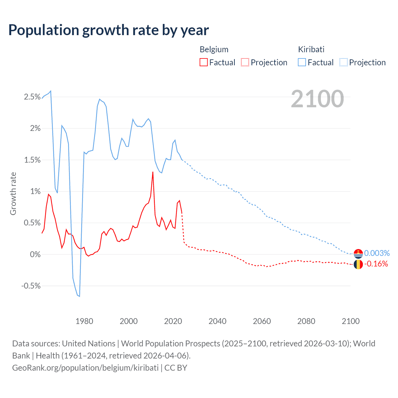 - For the last 10 years, Belgium has had an average growth rate of +0.55% per year vs +1.53% in Kiribati.