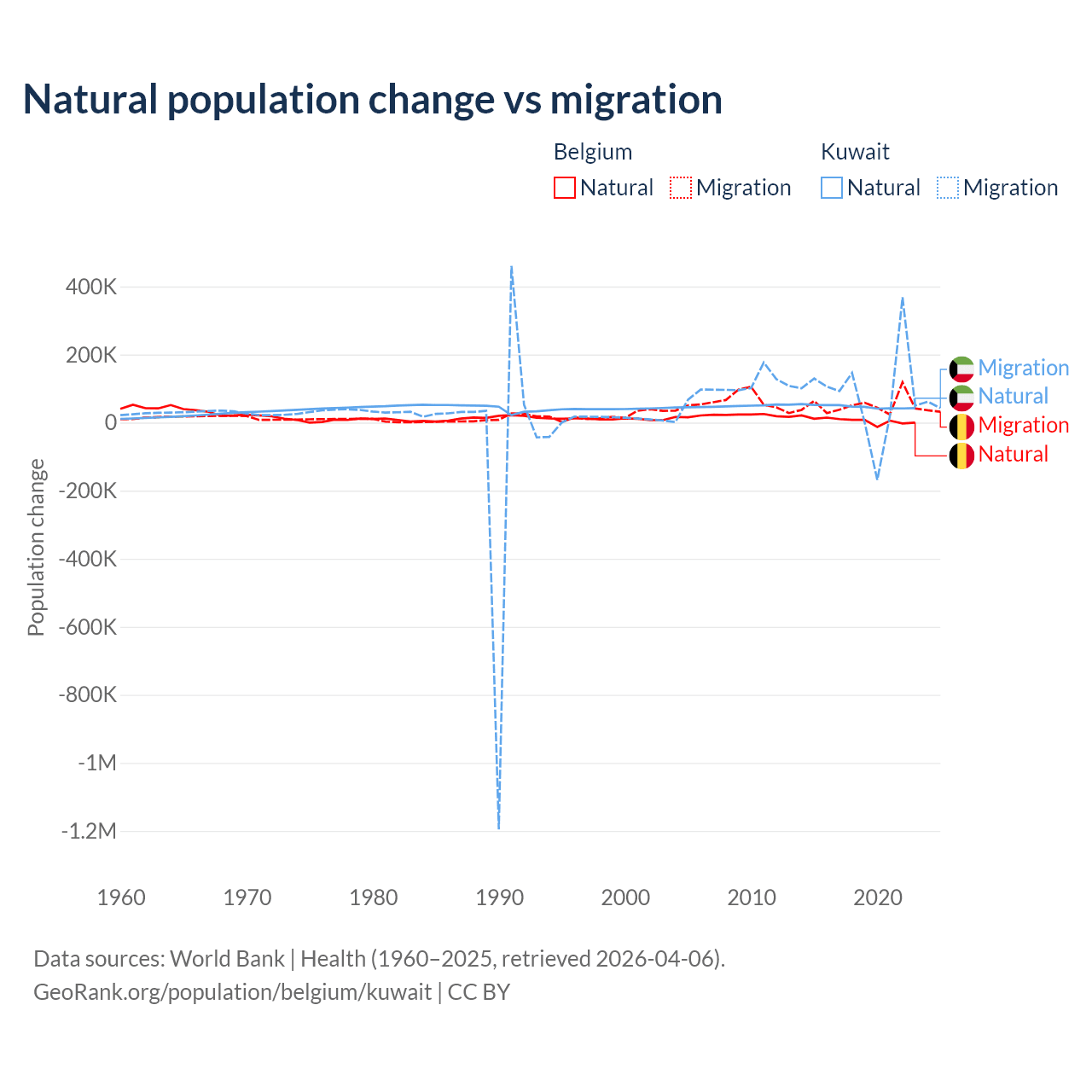Over the last 10 years, 11.3% of the population change in Belgium is from natural causes (a gain of 64,346 people) and 88.7% is from migration (a gain of 504,240 people). In Kuwait 35.8% is from natural causes (a gain of 470,645 people) and 64.2% is from migration (a gain of 845,142 people).