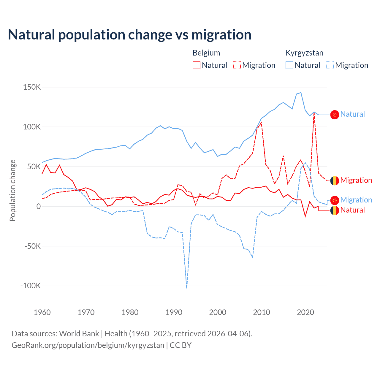 Over the last 10 years, 11.3% of the population change in Belgium is from natural causes (a gain of 64,346 people) and 88.7% is from migration (a gain of 504,240 people). In Kyrgyzstan 88.5% is from natural causes (a gain of 1,258,837 people) and 11.5% is from migration (a gain of 164,132 people).
