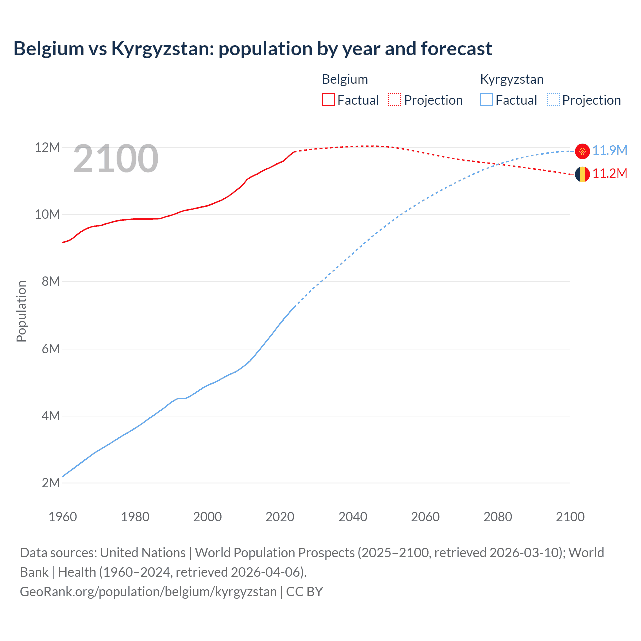 The latest officially reported population of Belgium was 11,858,610 in 2024 vs 7,221,868 people in Kyrgyzstan in 2024. In 2026, based on the adjusted UN estimation, the current Belgium's population is 11,902,714 people compared to 7,471,102 in Kyrgyzstan.