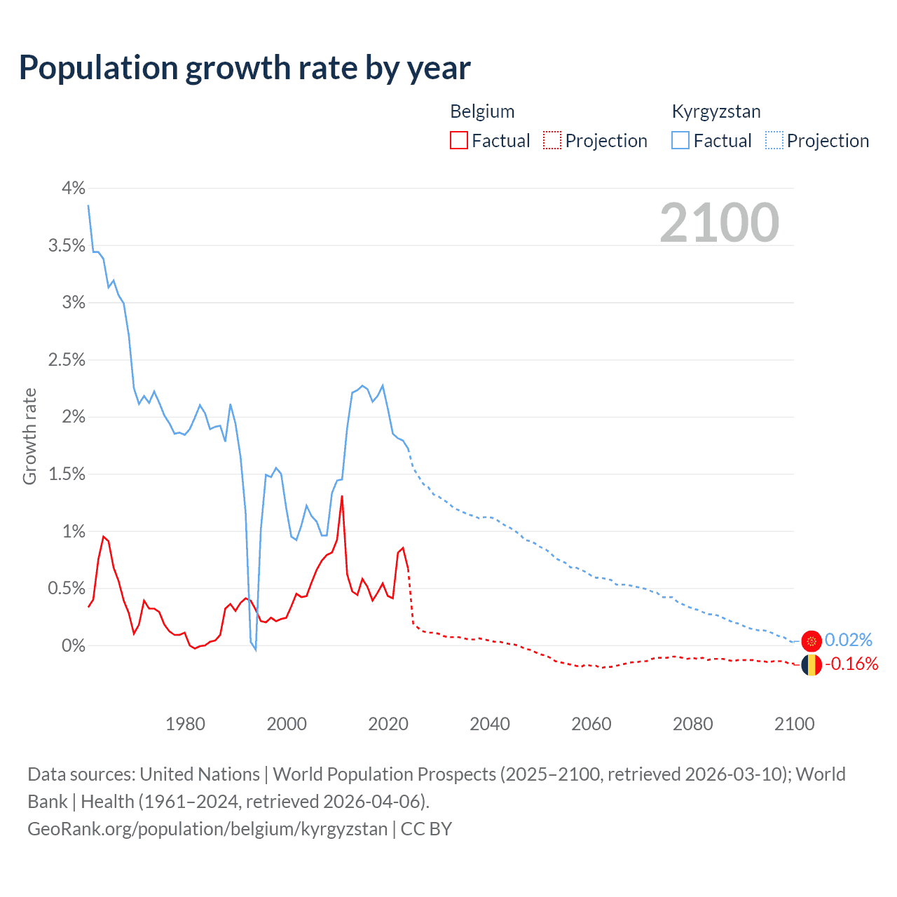 - For the last 10 years, Belgium has had an average growth rate of +0.55% per year vs +2.05% in Kyrgyzstan.
