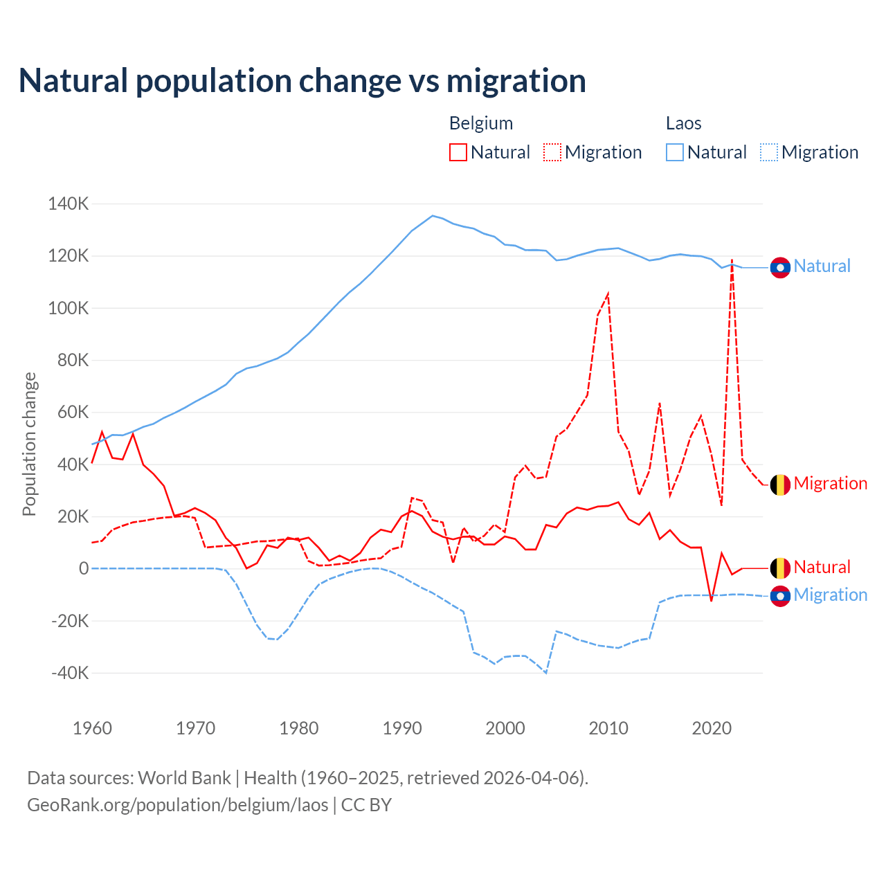 Over the last 10 years, 11.3% of the population change in Belgium is from natural causes (a gain of 64,346 people) and 88.7% is from migration (a gain of 504,240 people). In Laos 90.6% is from natural causes (a gain of 1,183,013 people) and 9.41% is from migration (a loss of 122,899 people).