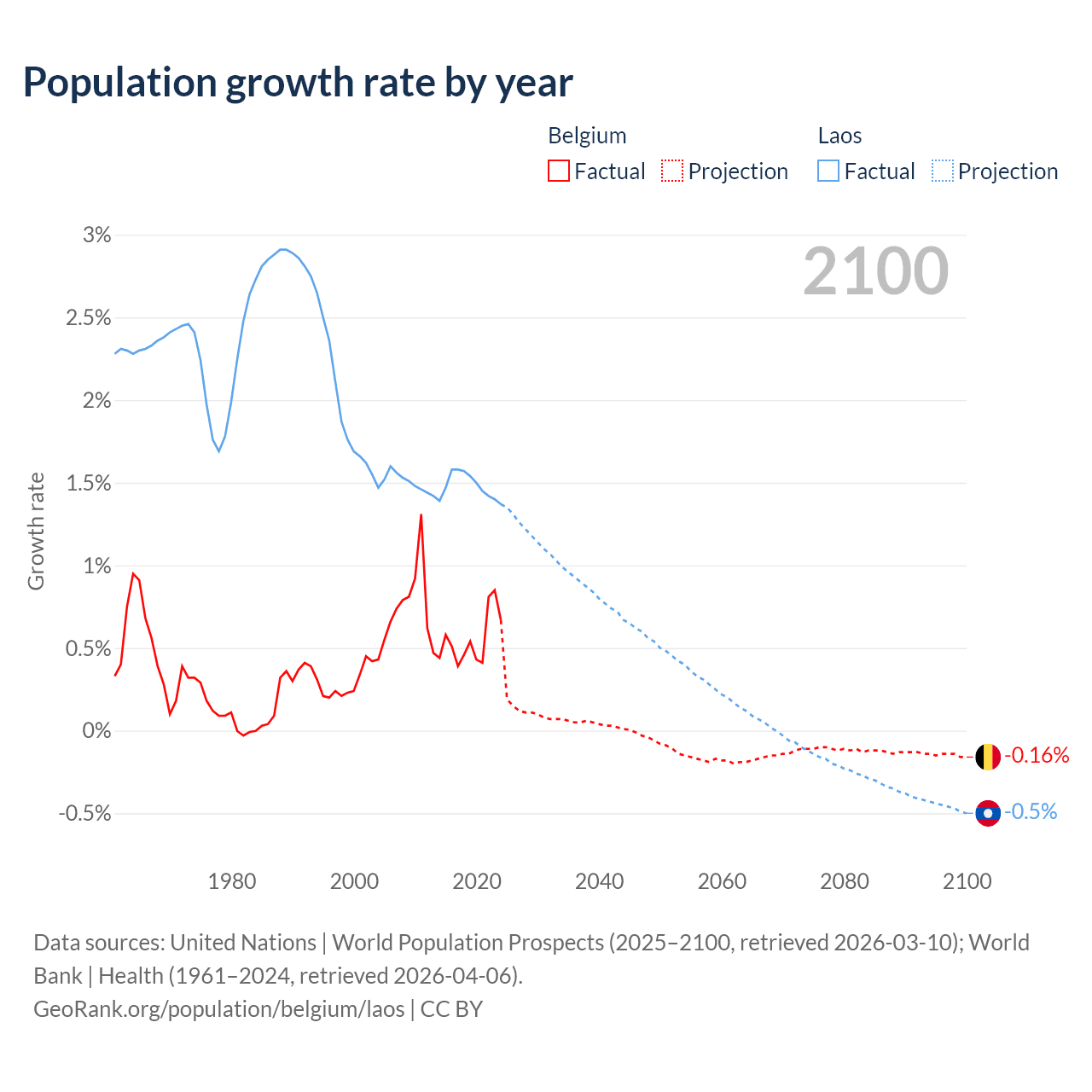 - For the last 10 years, Belgium has had an average growth rate of +0.55% per year vs +1.48% in Laos.