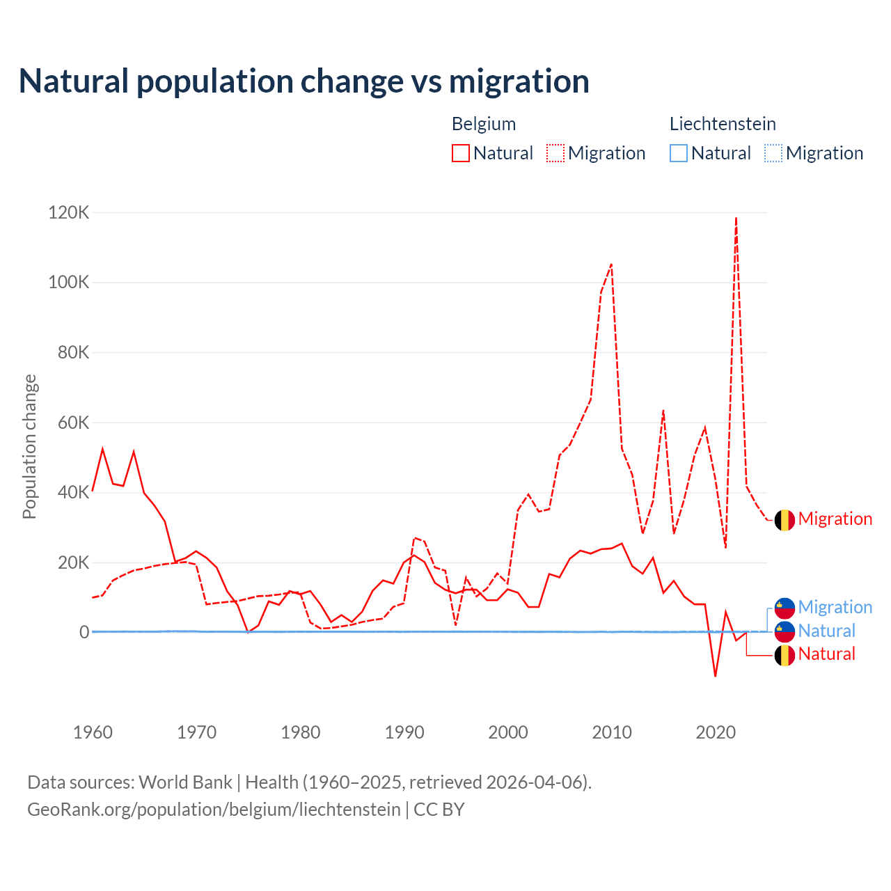 Over the last 10 years, 11.3% of the population change in Belgium is from natural causes (a gain of 64,346 people) and 88.7% is from migration (a gain of 504,240 people). In Liechtenstein 32.4% is from natural causes (a gain of 883 people) and 67.6% is from migration (a gain of 1,843 people).