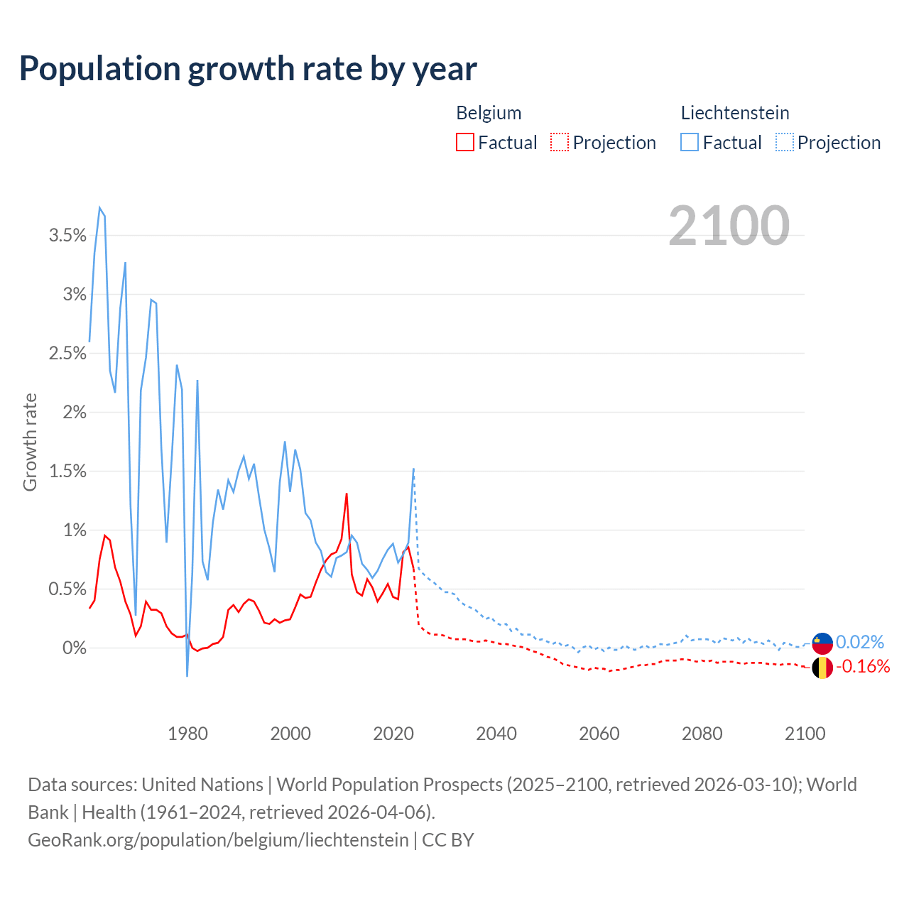 - For the last 10 years, Belgium has had an average growth rate of +0.55% per year vs +0.82% in Liechtenstein.