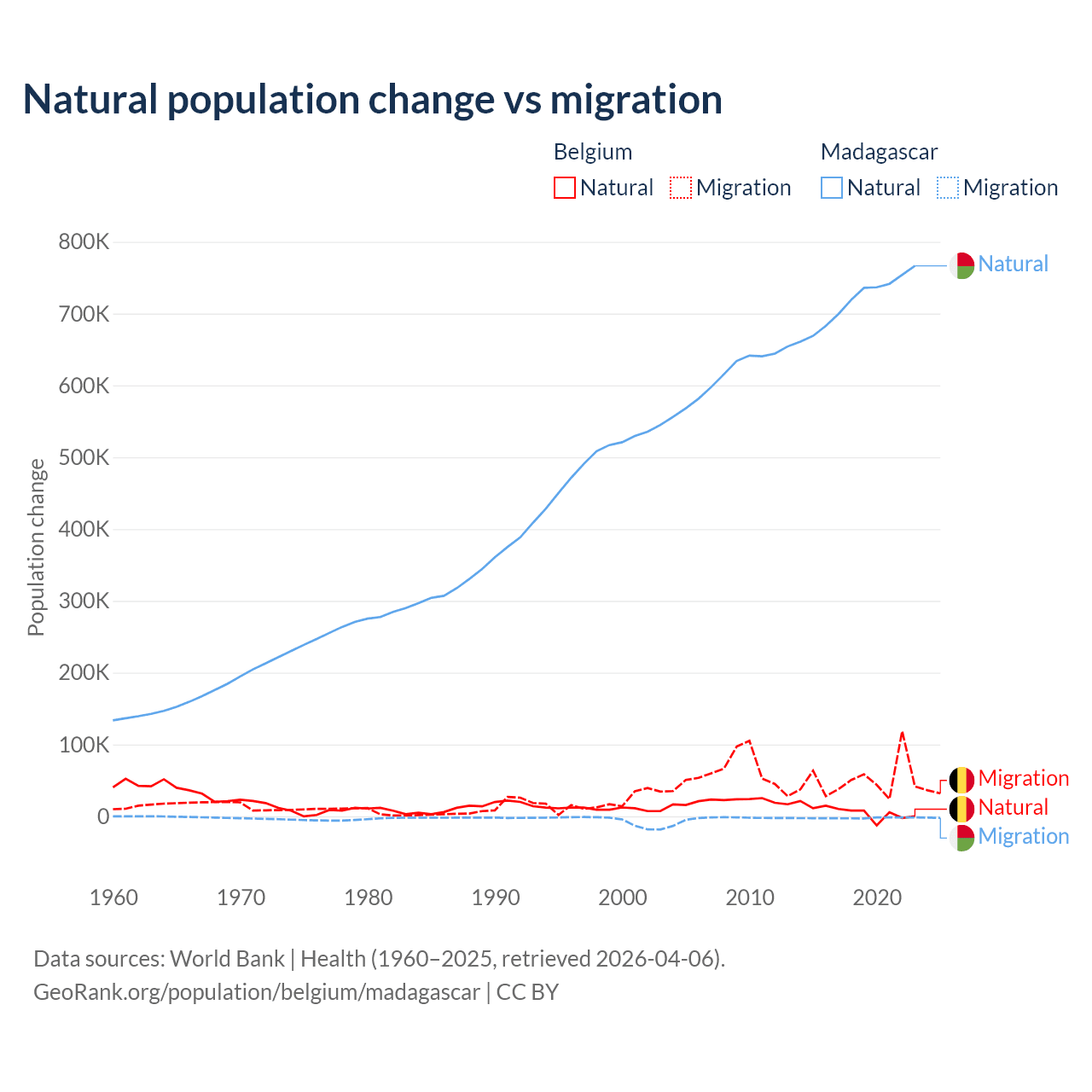 Over the last 10 years, 11.3% of the population change in Belgium is from natural causes (a gain of 64,346 people) and 88.7% is from migration (a gain of 504,240 people). In Madagascar 99.7% is from natural causes (a gain of 7,165,578 people) and 0.31% is from migration (a loss of 22,384 people).