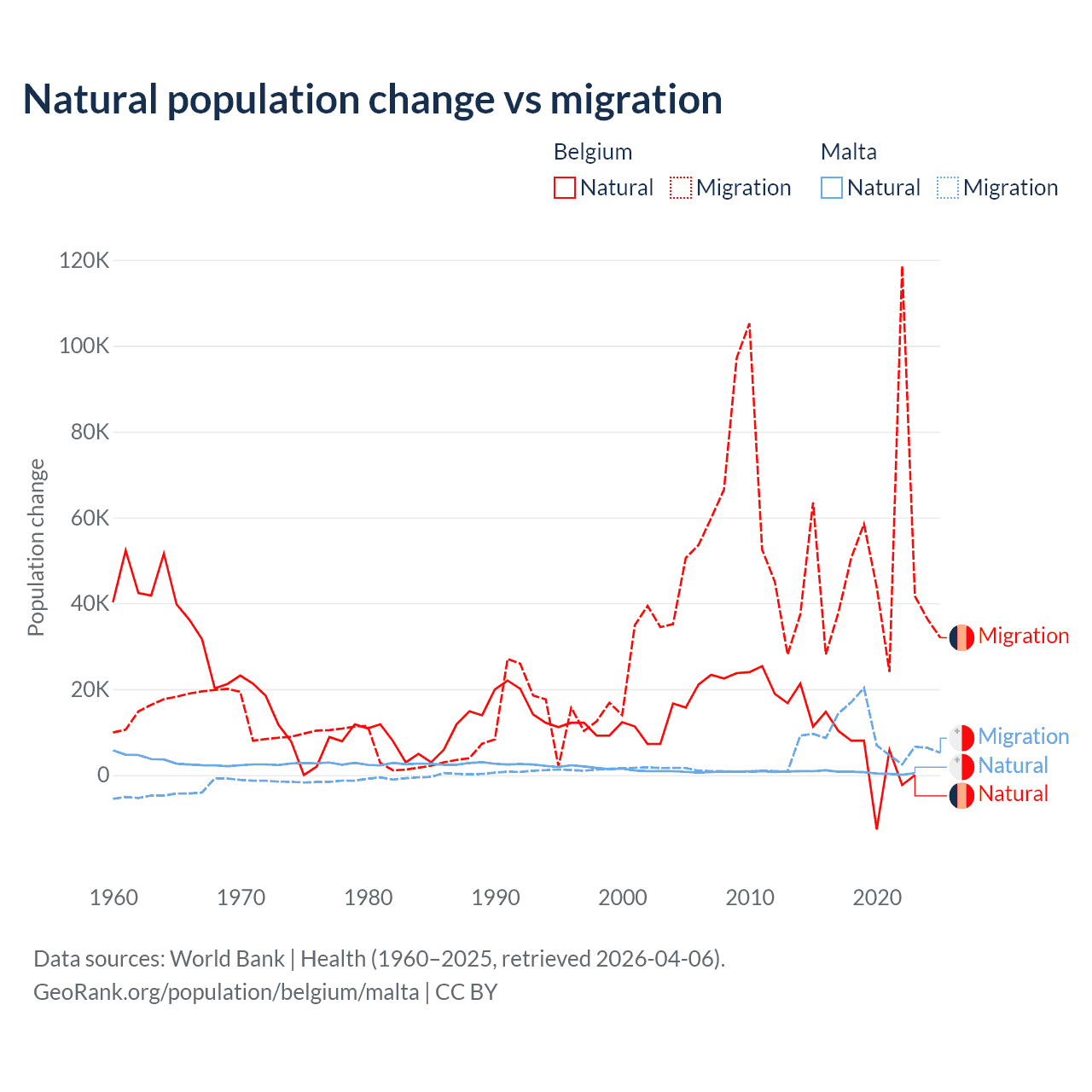Over the last 10 years, 11.3% of the population change in Belgium is from natural causes (a gain of 64,346 people) and 88.7% is from migration (a gain of 504,240 people). In Malta 5.84% is from natural causes (a gain of 6,181 people) and 94.2% is from migration (a gain of 99,652 people).