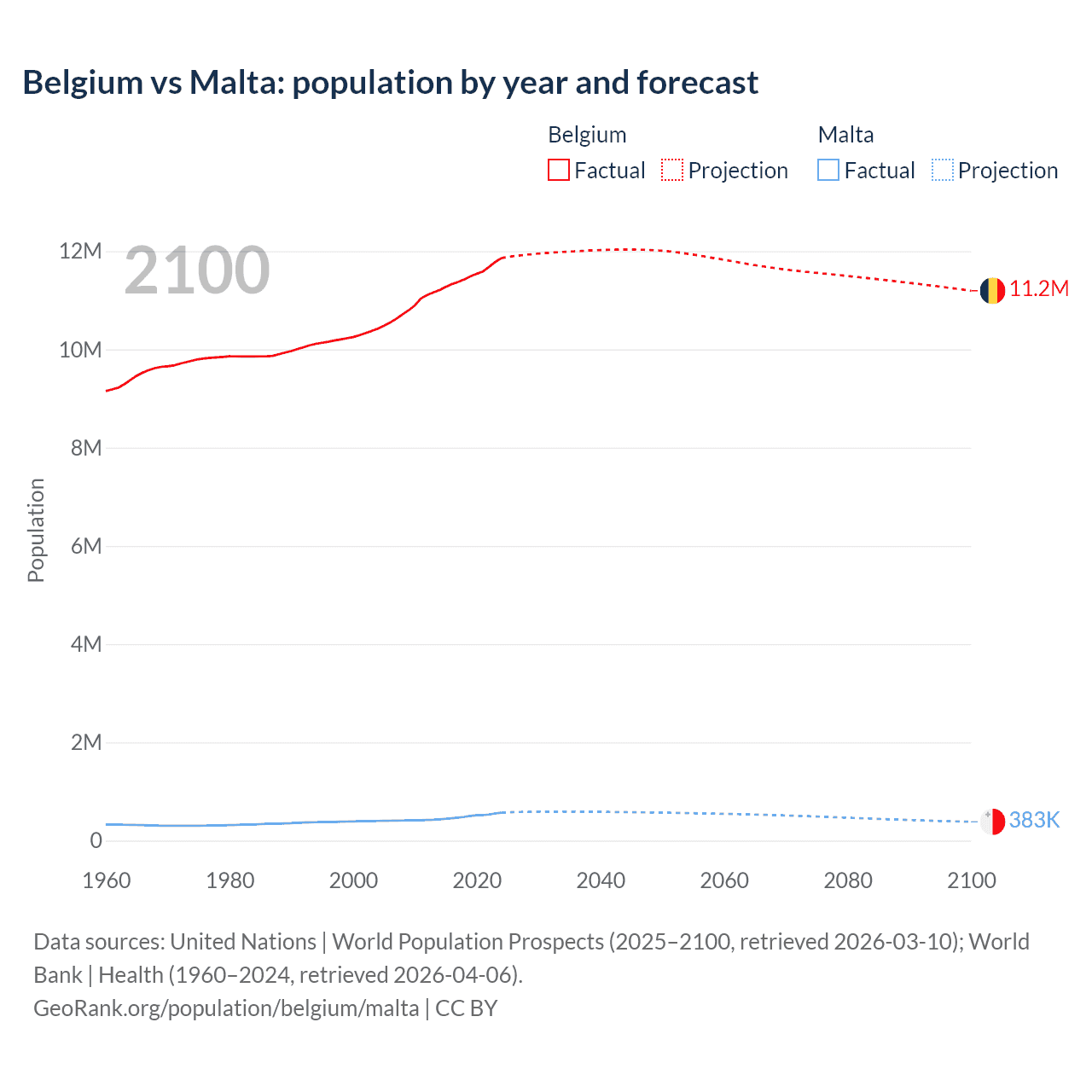 The latest officially reported population of Belgium was 11,858,610 in 2024 vs 568,847 people in Malta in 2024. In 2026, based on the adjusted UN estimation, the current Belgium's population is 11,902,714 people compared to 581,729 in Malta.